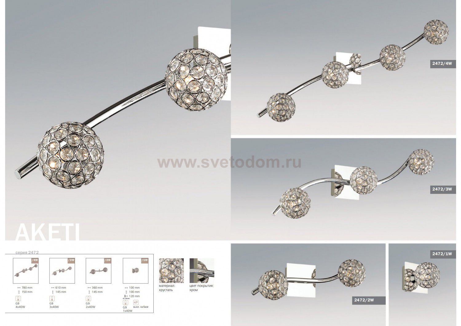 Подсветка 2472 / 2W линии Aketi выполнена в стиле модерн и украшена плафонами в виде сфер, состоящими из круглого прозрачного хрусталя, которые в темноте создают прекрасные блики и узоры на стенах. Цоколь G9. Мощность 2*40W. Нет ламп в комплекте.