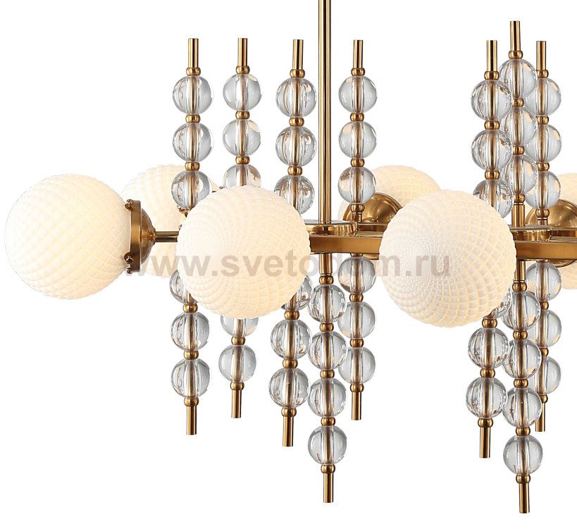 Люстра на штанге 2120/03/10P Stilfort серии Queenly выполена в стиле модерн. Арматура изготовлена из металла в цвете "золото" и украшена декоративными стеклянными элементами. Плафоны люстры выполнены из матового стекла.