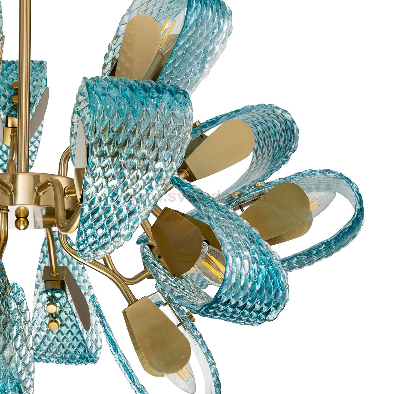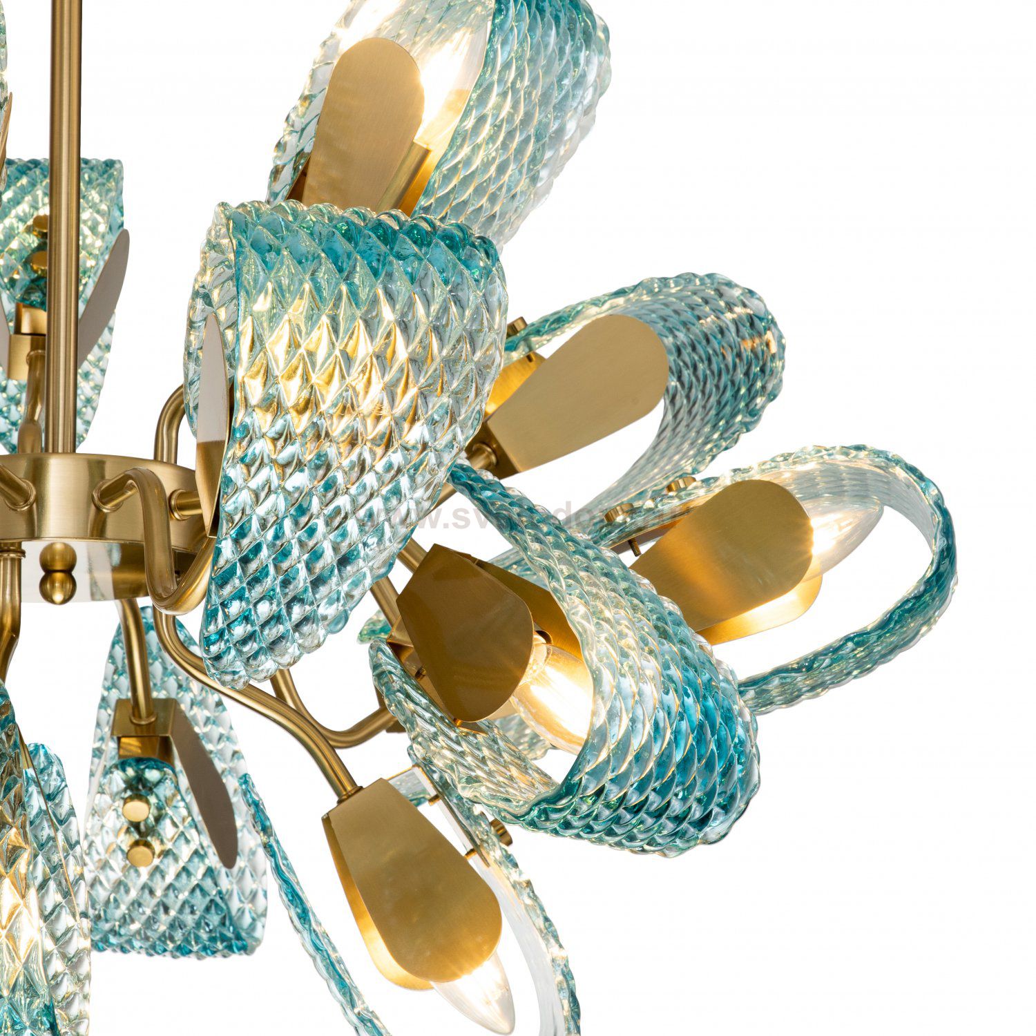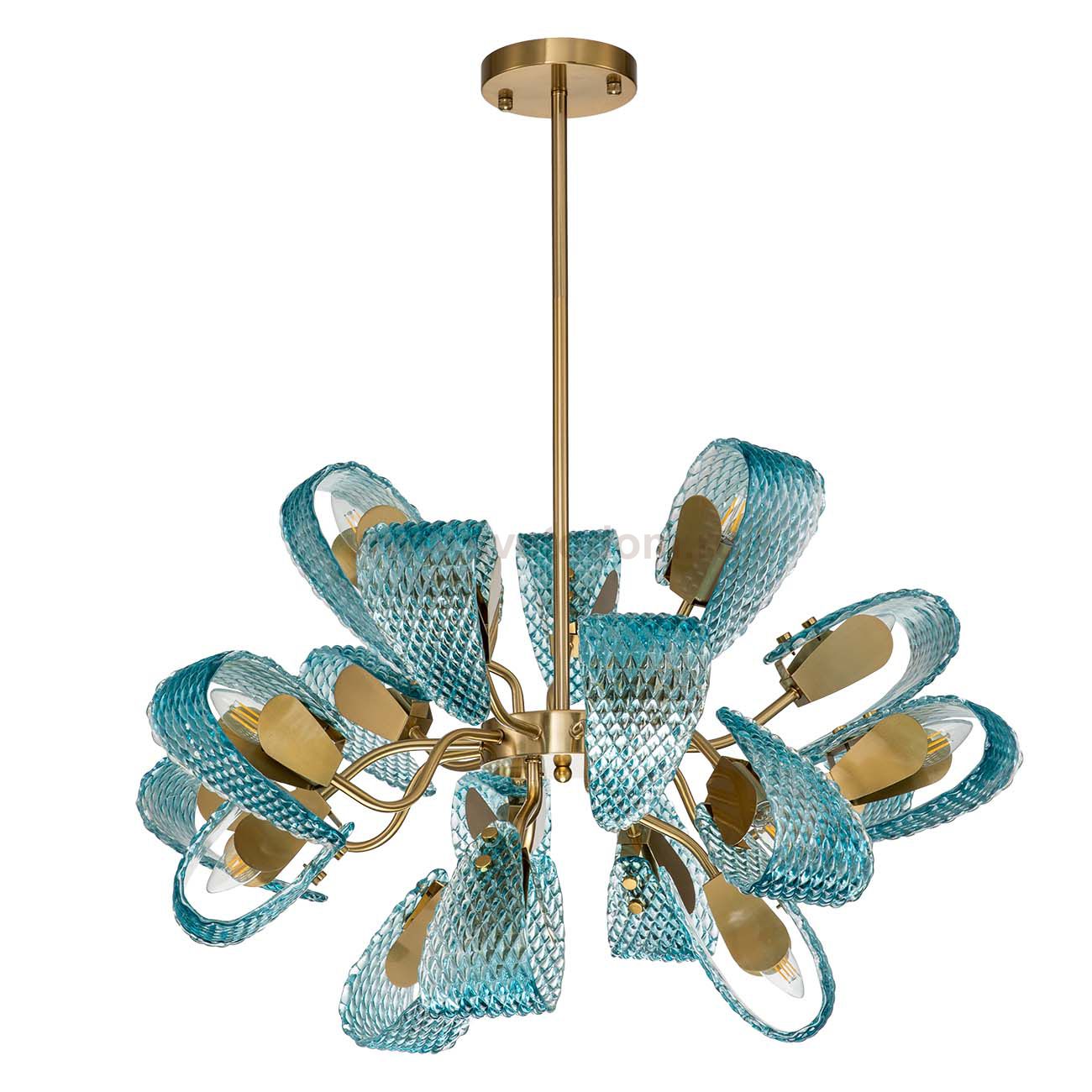 Пламенная коллекция FLESS вдохновлена мифическим персонажем - огненным фениксом. Серия представлена подвесными светильниками, светильником на штанге и настенным светильником.Конструкция светильников выполнена в плавных летящих металлических линиях, что отражает возвышенность птицы Феникс. Фактурные стеклянные плафоны выполнены в сложной изогнутой форме, они, словно оперение, хаотично расположены на арматуре. Проходящий через них свет превращается в настоящий огненный танец. Идея живительного для феникса огня также нашла отражение в цветах коллекции: бронзовом, янтарном и голубом. Размер 800*800*545/1100 Мощность E14 40W*18 Цвет БРОНЗА/ГОЛУБОЙ Материал МЕТАЛЛ/СТЕКЛО
