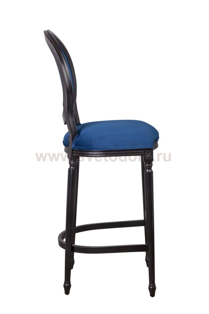 Стул барный Kosco Kora Blue на высоких ножках, декорированных резьбой и соединенных между собой попарно нижними планками. Каркас выполнен из натурального букового дерева. Обивка из велюра, мягкое сиденье и круглая спинка, напоминающая медальон в деревянном обрамлении.