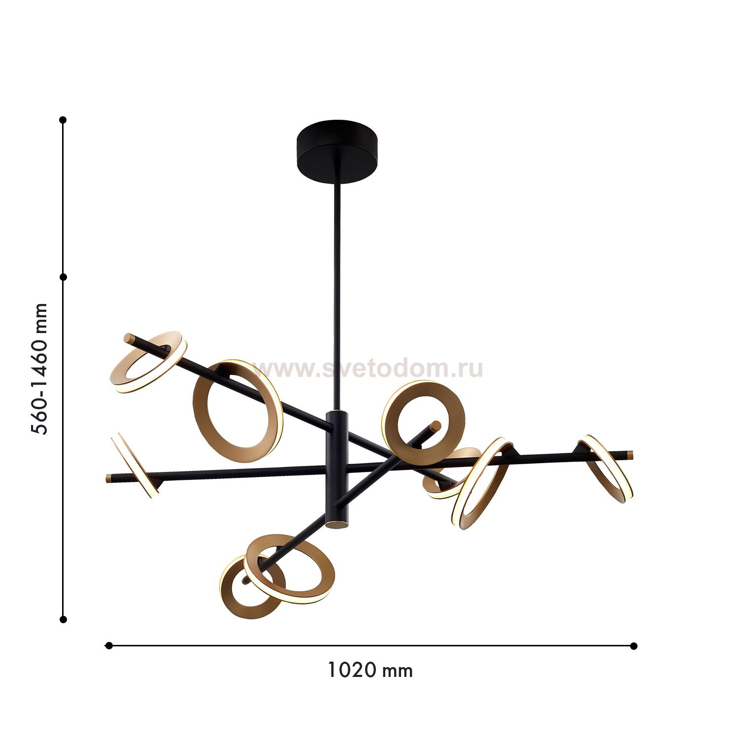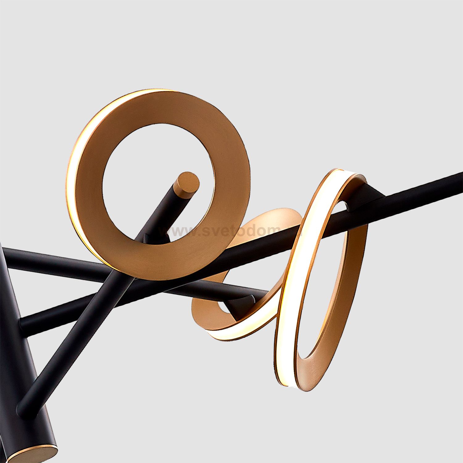 Потолочная люстра сочетает в себе объемные кольца цвета матового золота, которые светятся по периметру с помощью встроенной LED-ленты. Они закреплены Серия