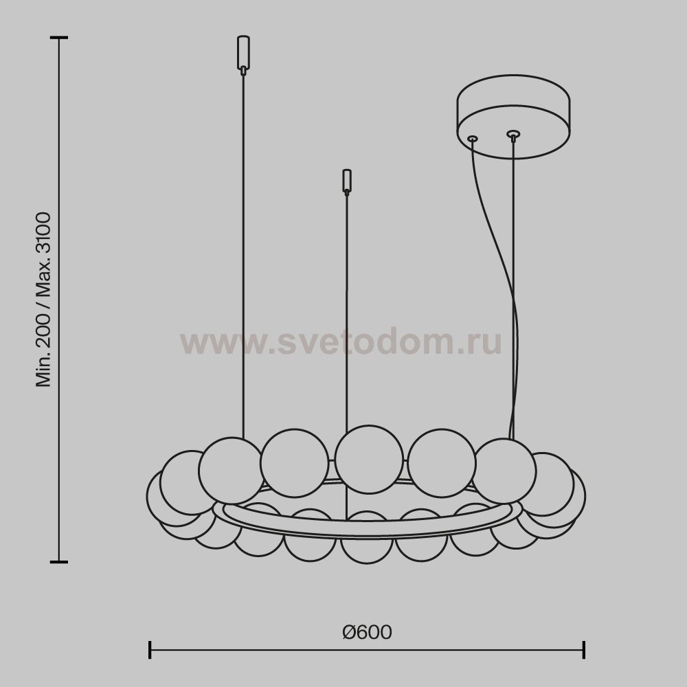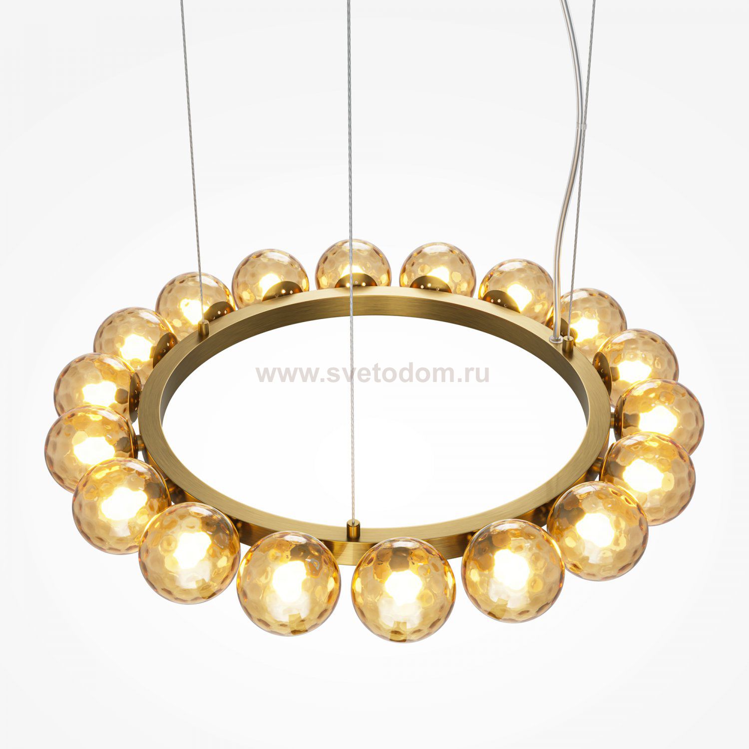 Металлическая арматура цвета латуни с сатинированным эффектом. Яркие небольшие плафоны диаметром 80 мм цвета янтаря. Встроенный LED источник света дает мощный световой поток с цветовой температурой 3000К и углом рассеивания 120 градусов. Подвесные светильники выполнены в виде перевернутой арки и в трендовой форме круга, расположение плафонов настенного светильника напоминает созвездие.