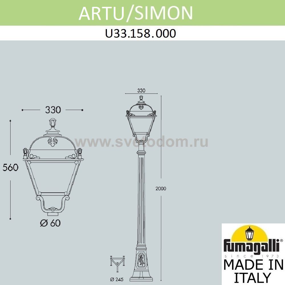 Касаемо артикула U33.158.000.AXH27 важно знать - Садово-парковый фонарь FUMAGALLI среднего размера серии SIMON, модель ARTU/SIMON. Парковый фонарь с 1 венчающим светильником большого размера в на классическом столбе ARTU высотой 1,5 м (+высота фонаря). Предназначен для освещения парковых дорожек, cкверов, садовых и ландшафтных композиций, и других общественных пространств. Используется в качестве основного уличного освещения на городских улицах и площадях. Изготовлены в Италии, по уникальным технологиям "FUMATECH" из современного композитного полимера RESIN. Этот материал в 5 раз прочнее металла, не ржавеет, не окисляется, не выгорает на солнце, его не нужно красить. Все светильники пыле-влаго защищены по стандарту IP55 (Пылезащищенные, защита от водяных струй с любого направления). Рассеиватель выполнен из антивандального, не мутнеющего и не горючего PMMA (ПолиМетилМетаАкрилат). Срок службы светильника - не менее 20 лет. Температура использования от -60 до +90. В серии SIMON есть садовые фонари в настенном (OFIR/SIMON, MIRRA/SIMON) подвесном (SICHEM/SIMON) и наземном исполнении (IAFAET.R/SIMON, ALOE.R/SIMON, ARTU/SIMON, GIGI/SIMON, RICU/SIMON, NEBO/OFIR/SIMON 1L, NEBO/OFIR/ANNA 2L, TABOR/ADAM/SIMON 3L) со столбами разной высоты, с разным количеством и конфигурацией голов. Консоли настенных фонарей и кронштейны светильников на столбах освещения могут устанавливаться в положение вверх и вниз. Столбы выше 150 см имеют в основе мощную стальную трубу с двойной оцинковкой. При заказе требуется выбрать цвет корпуса, цвет плафона и тип патрона (Е-27 или LED GX-53). Возможен светодиодный вариант. По стилю и дизайну серия уличных светильников SIMON похожа на светильники среднего размера серии CEFA. По размеру относится к большим парковым светильникам как серия NOEMI и GLOBE 400.