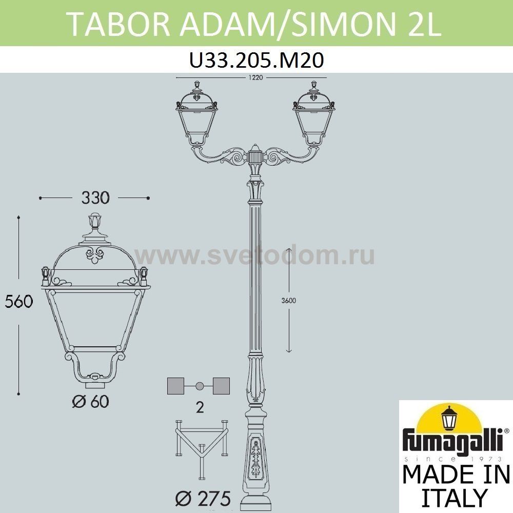 Касаемо артикула U33.205.M20.AXH27 важно знать - Парковый фонарь FUMAGALLI большого размера серии SIMON, модель TABOR ADAM/SIMON 2L. Парковый фонарь с 2 светильниками большого размера, на консолях ADAM большого размера, установленных на классическом столбе TABOR высотой 3,0 м (+высота фонарей на кронштейнах). Изготовлены в Италии, по уникальным технологиям "FUMATECH" из современного композитного полимера RESIN. Этот материал в 5 раз прочнее металла, не ржавеет, не окисляется, не выгорает на солнце, его не нужно красить. Все светильники пыле-влаго защищены по стандарту IP55 (Пылезащищенные, защита от водяных струй с любого направления). Рассеиватель выполнен из антивандального, не мутнеющего и не горючего PMMA (ПолиМетилМетаАкрилат). Срок службы светильника - не менее 20 лет. Температура использования от -60 до +90. В серии SIMON есть садовые фонари в настенном (OFIR/SIMON, MIRRA/SIMON) подвесном (SICHEM/SIMON) и наземном исполнении (IAFAET.R/SIMON, ALOE.R/SIMON, ARTU/SIMON, GIGI/SIMON, RICU/SIMON, NEBO/OFIR/SIMON 1L, NEBO/OFIR/ANNA 2L, TABOR/ADAM/SIMON 3L) со столбами разной высоты, с разным количеством и конфигурацией голов. Консоли настенных фонарей и кронштейны светильников на столбах освещения могут устанавливаться в положение вверх и вниз. Столбы выше 150 см имеют в основе мощную стальную трубу с двойной оцинковкой. При заказе требуется выбрать цвет корпуса, цвет плафона и тип патрона (Е-27 или LED GX-53). Возможен светодиодный вариант. По стилю и дизайну серия уличных светильников SIMON похожа на светильники среднего размера серии CEFA. По размеру относится к большим парковым светильникам как серия NOEMI и GLOBE 400.