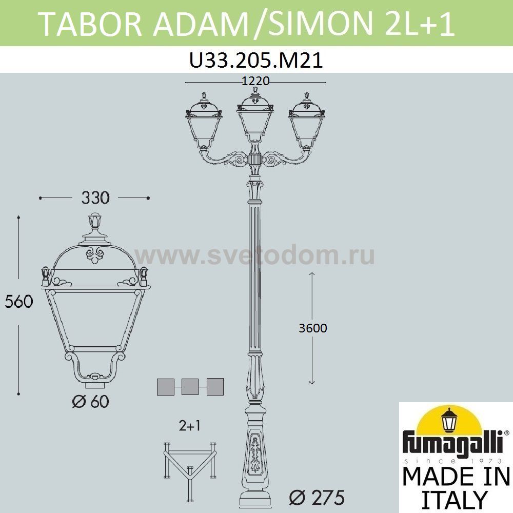 Касаемо артикула U33.205.M21.AXH27 важно знать - Парковый фонарь FUMAGALLI большого размера серии SIMON, модель TABOR ADAM/SIMON 2L+1. Парковый фонарь с 2 светильниками большого размера, на консолях ADAM большого размера, плюс 1 венчающий светильник, установленные на классическом столбе TABOR высотой 3,0 м (+высота фонарей на кронштейнах). Изготовлены в Италии, по уникальным технологиям "FUMATECH" из современного композитного полимера RESIN. Этот материал в 5 раз прочнее металла, не ржавеет, не окисляется, не выгорает на солнце, его не нужно красить. Все светильники пыле-влаго защищены по стандарту IP55 (Пылезащищенные, защита от водяных струй с любого направления). Рассеиватель выполнен из антивандального, не мутнеющего и не горючего PMMA (ПолиМетилМетаАкрилат). Срок службы светильника - не менее 20 лет. Температура использования от -60 до +90. В серии SIMON есть садовые фонари в настенном (OFIR/SIMON, MIRRA/SIMON) подвесном (SICHEM/SIMON) и наземном исполнении (IAFAET.R/SIMON, ALOE.R/SIMON, ARTU/SIMON, GIGI/SIMON, RICU/SIMON, NEBO/OFIR/SIMON 1L, NEBO/OFIR/ANNA 2L, TABOR/ADAM/SIMON 3L) со столбами разной высоты, с разным количеством и конфигурацией голов. Консоли настенных фонарей и кронштейны светильников на столбах освещения могут устанавливаться в положение вверх и вниз. Столбы выше 150 см имеют в основе мощную стальную трубу с двойной оцинковкой. При заказе требуется выбрать цвет корпуса, цвет плафона и тип патрона (Е-27 или LED GX-53). Возможен светодиодный вариант. По стилю и дизайну серия уличных светильников SIMON похожа на светильники среднего размера серии CEFA. По размеру относится к большим парковым светильникам как серия NOEMI и GLOBE 400.
