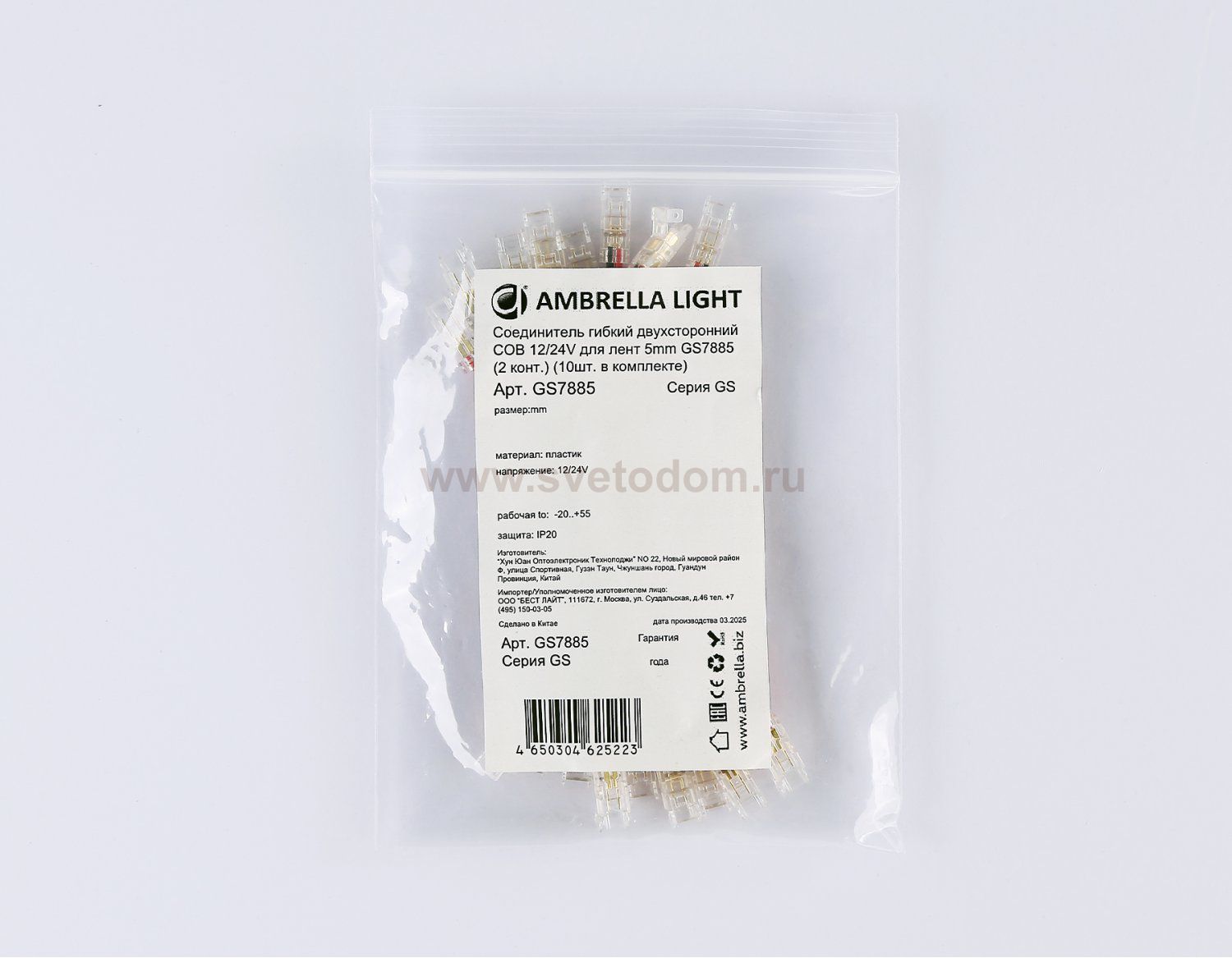 Соединитель гибкий двухсторонний COB 12/24V для лент 5mm GS7885 (2 конт.) (10шт. в комплекте) Размеры