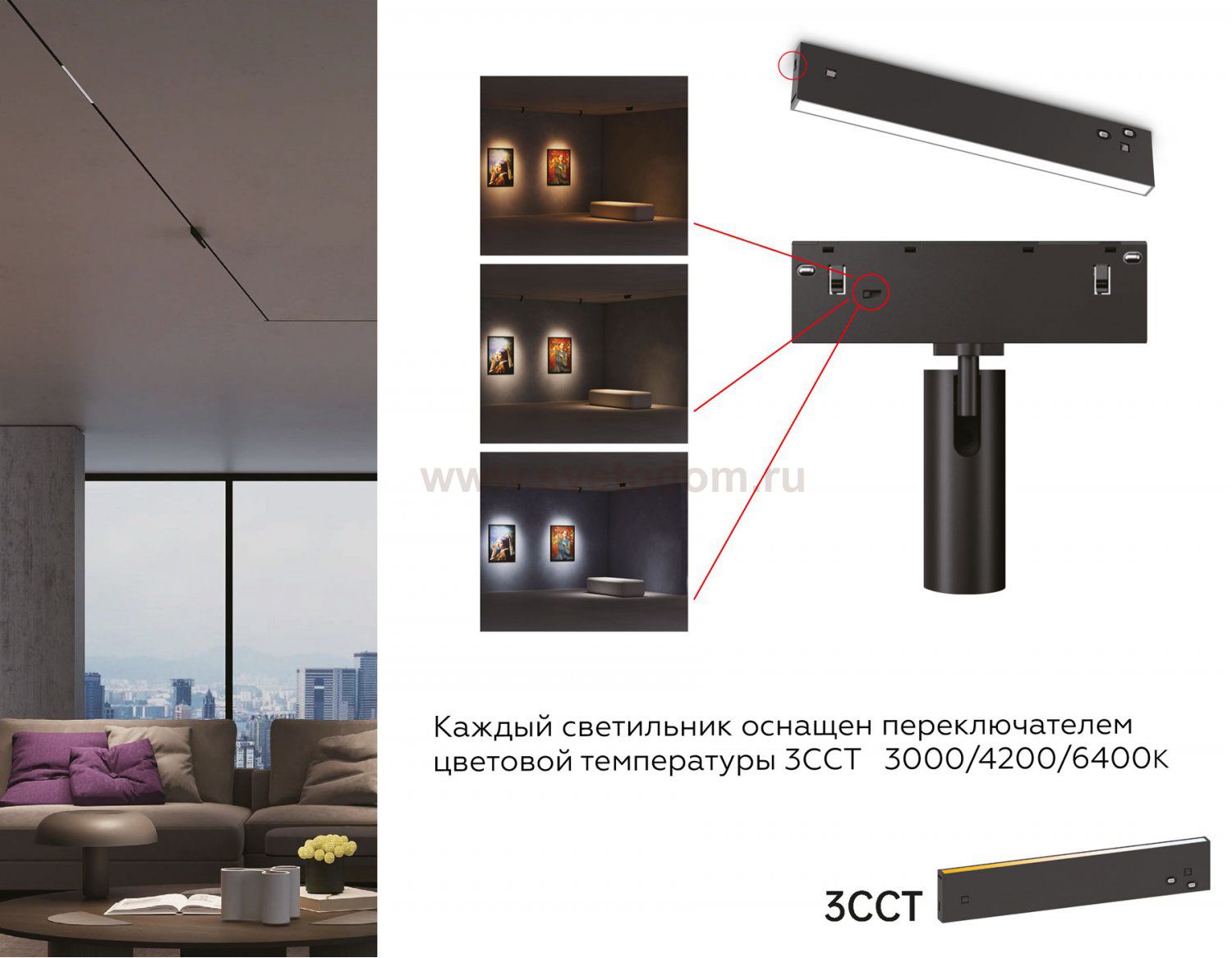 Трековый светильник 3CCT с механическим переключением температуры света на корпусе светильника. Работает со стандартным блоком питания 48V. Применяется для равномерного освещения 180°. Устанавливается на трековую систему Magnetic system 10mm 48V. Светильник оснащён надёжными светодиодами Sanan с высоким индексом цветопередачи CRI>90.