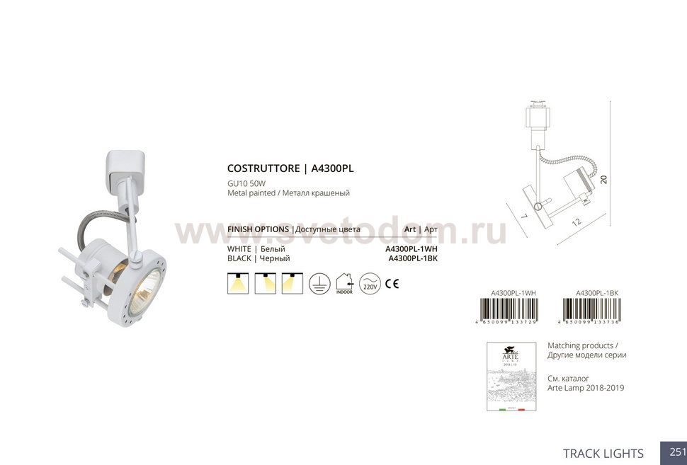 Светильник Arte Lamp A4300PL-1WH является важной составляющей современного функционального освещения на шинопроводе / треке для гостиной, зала, холла или другого помещения. При выборе обратите внимание на характеристики, позволяющие купить подходящие комплектующие из аналогичной коллекции и в той же цветовой гамме, что сделает помещение по-дизайнерски профессиональным и законченным.