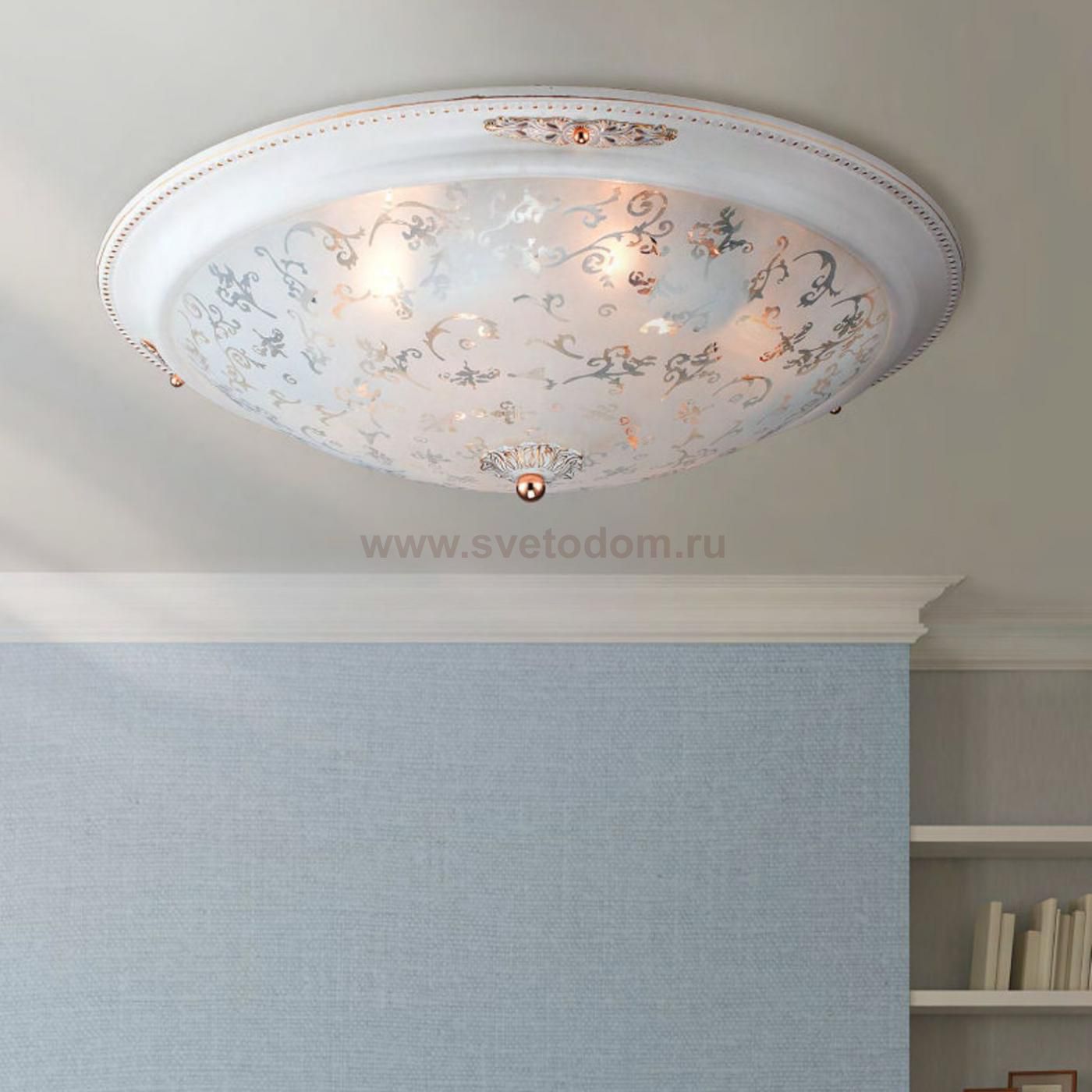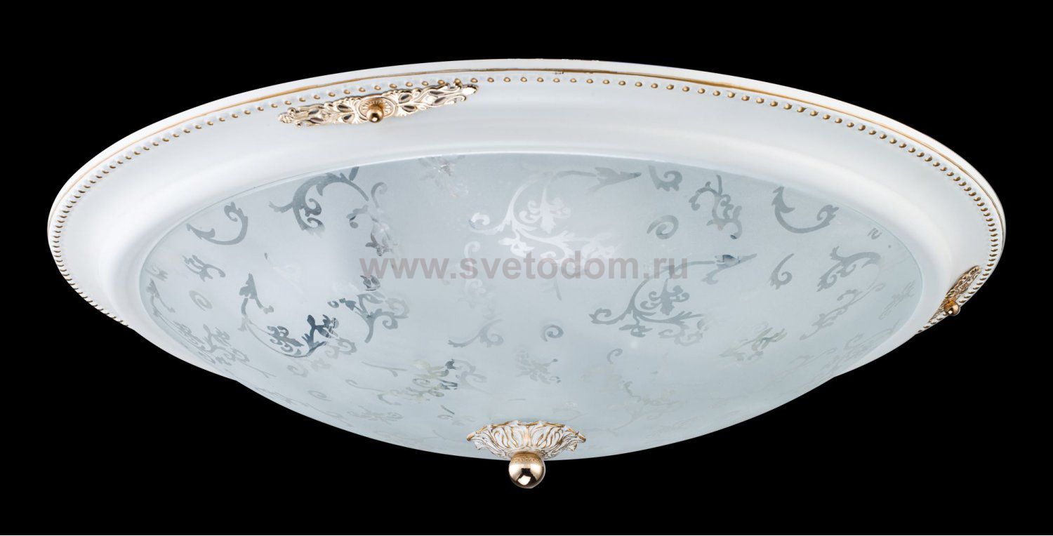 Для завершения образа комнаты прекрасно подойдет потолочная люстра от фирмы Майтони. Выполненная в стиле барокко, она внесет в интерьер торжественности и комфорта. На фото видны золотые элементы, которые обрамляют стеклянный плафон, выполненный из полуматового стекла с витиеватым узором, а белое основание придает особый шарм всей конструкции. |