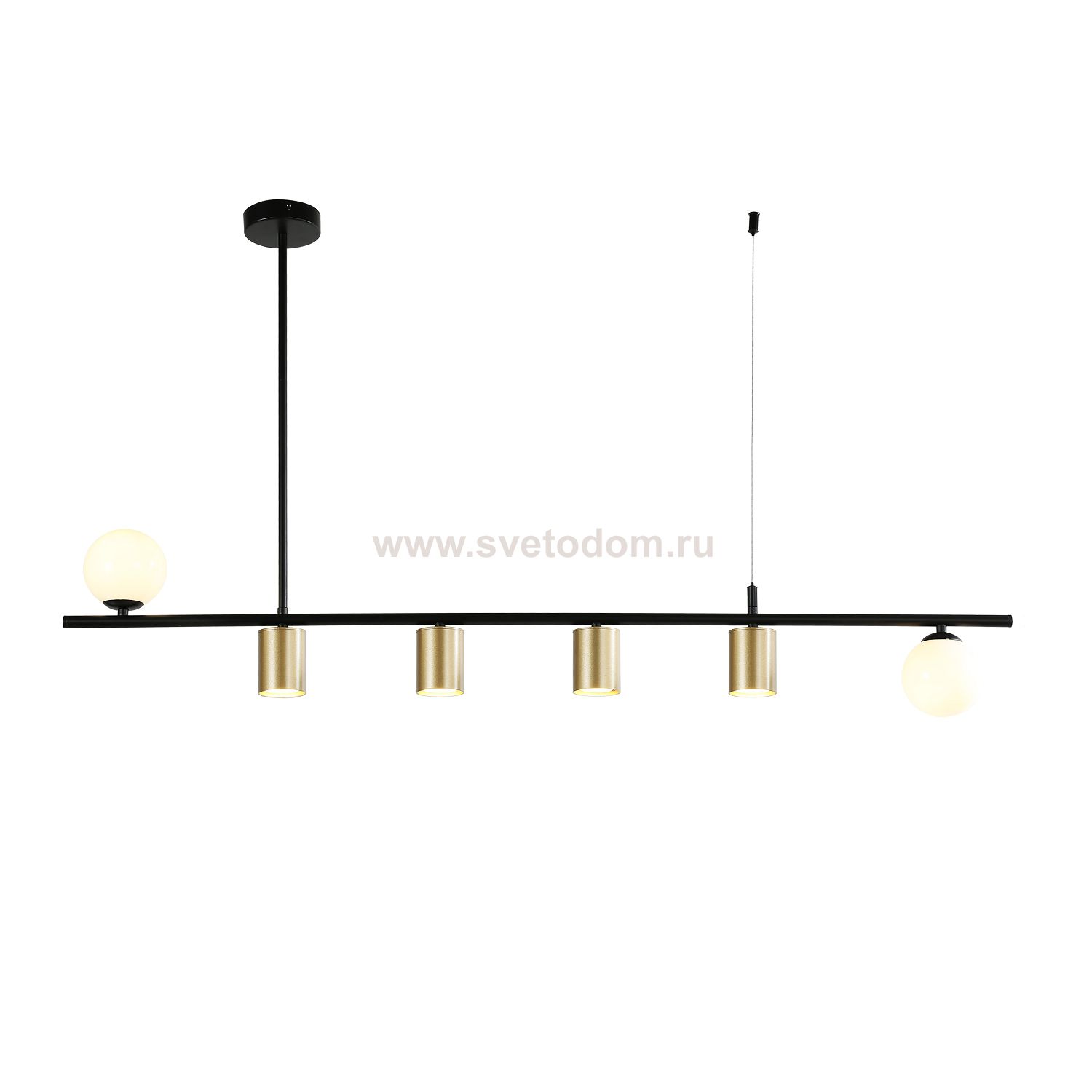 каркас матового черного цвета, два вида плафонов из белого стекла и металла цвета золота, лампы G9 и GU10 можно менять Цвет декора