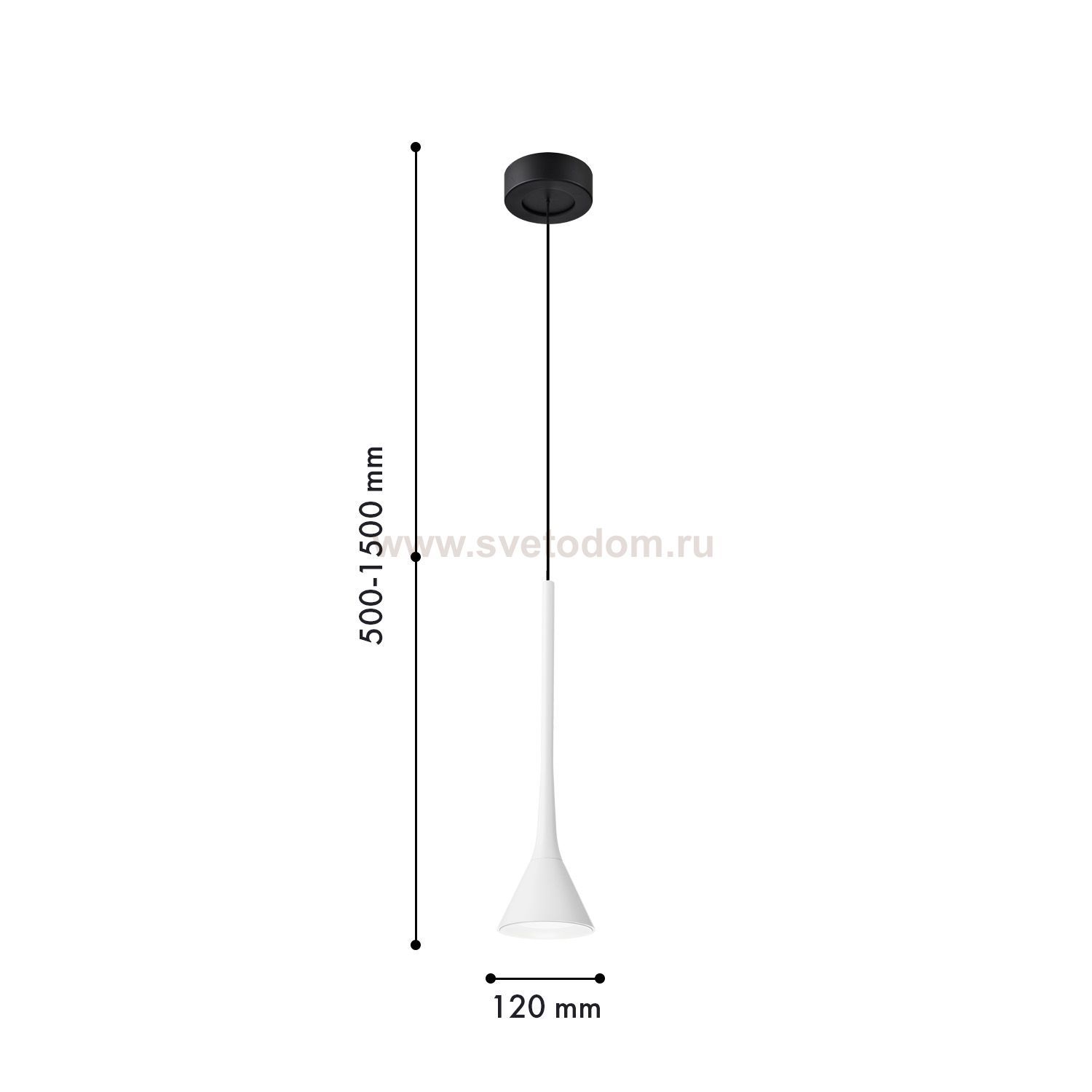 Подвес с черным каркасом, плафон из алюминия в форме тонкого удлиненного цилиндра с конусом на конце в белом цвете, в нижней части подвеса расположен Серия
