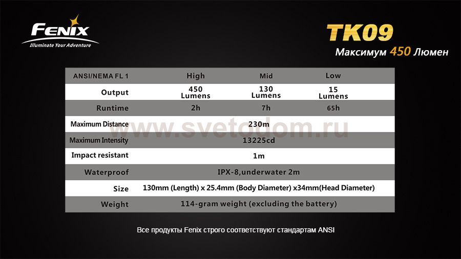 Имея «на борту» улучшенный американский светодиод Cree XP-G2 (R5), ТК09 демонстрирует потрясающую производительность и мощность — максимальный предел его яркости составляет 450 люмен при дальнобойности в 230 метров. Всего в модели реализовано три оптимальных варианта освещения (450 люмен, 130 люмен и 15 люмен) , управление которыми производится тактовой кнопкой в хвосте фонаря. Модернизация светодиода также повлекла за собой значительное сужение пучка света и повышение его показателей в плане сконцентрированност и и дальнобойности . В целом, однокнопочный интерфейс — оптимальный вариант для подствольного фонаря , так как смена режимов, активация кратковременной и постоянной подсветки производится очень оперативно и всегда безошибочно. Расположение тактового переключателя в хвосте изделия лишь облегчает управление , а уникальный дизайн, при котором кнопка не выступает за кромку, обеспечивает горизонтальную устойчивость модели и позволяет использовать ТК09 по принципу свечи. Ещё один аргумент в пользу ТК09, как лучшего выбора в качестве подствольного фонаря, является тот факт, что он совместим со всеми вспомогательными аксессуарами: фильтрами, выносной тактовой кнопкой, креплениями. Создатели не упустили весьма значимые детали дизайна, которые также эффективно способствуют повышению общей эргономик и тактического фонаря в экстремальных условиях дикой природы. Так, мы можем наблюдать зажимно е кольц о на корпусе, цепкую накатку и наличие защитных выступающих кромок в хвосте и в голове ТК09, которые в совокупности обеспечивают надёжный хват и сохранность наиболее важных рабочих деталей фонаря (оптика, кнопка управления). Немаловажным для пользователей может оказаться тот факт, что в качестве источников энергии ТК09 использует всего лишь один аккумулятор типа 18650 или две батарейки CR123A — самые устойчивые и ёмкие элементы питания. А в совокупности с современной схемотехникой мы получаем экономный экземпляр светодиодного фонаря с рациональным распределением доступной энергии. Традиционно присутствует защита от неправильной установки элементов питания , функция поддержания постоянной яркости и предупреждение о низком зар я де батарей. В дополнение ко всему, обновлённый Fenix ТК09 безусловно обладает высоким показател я м и гидроизоляции и прочности — водонепроницаемость модели отвечает IPX-8 стандарту , а оптика изготовлена из устойчивого к повреждениям стекла . Корпус ный каркас модели выполнен из алюминиевого сплава, имеет жёстк ое Premium анодирование ( III степени ) поверхности и антиабразивн ое покрытие. Особенности модели Fenix TK09: Усовершенствованный светодиод Cree XP-G2 (R5); Питание от одного Li-ion аккумулятора 18650 или от двух 3V CR123A батарей; Защита от неправильной установки элементов питания; Кнопка прямого клика с функцией мгновенной активации света; Корпус изготовлен из авиационного алюминия, имеет жёстк ое анодирование III (Premium) степени с антиабразивным покрытием; Оптическая часть выполнена из закалённого ультра-чистого стекла с антибликовым покрытием |