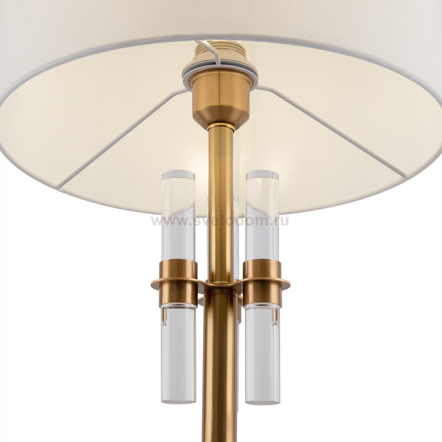 Металлическая арматура. Цвет – латунь. Тканевые абажуры белого оттенка. Декор – прозрачные акриловые трубки. Трендовая комбинация фактур и материалов. Широкий ассортимент. Торшер и подвес с цоколем Е27, лампа, бра и люстры – Е14.