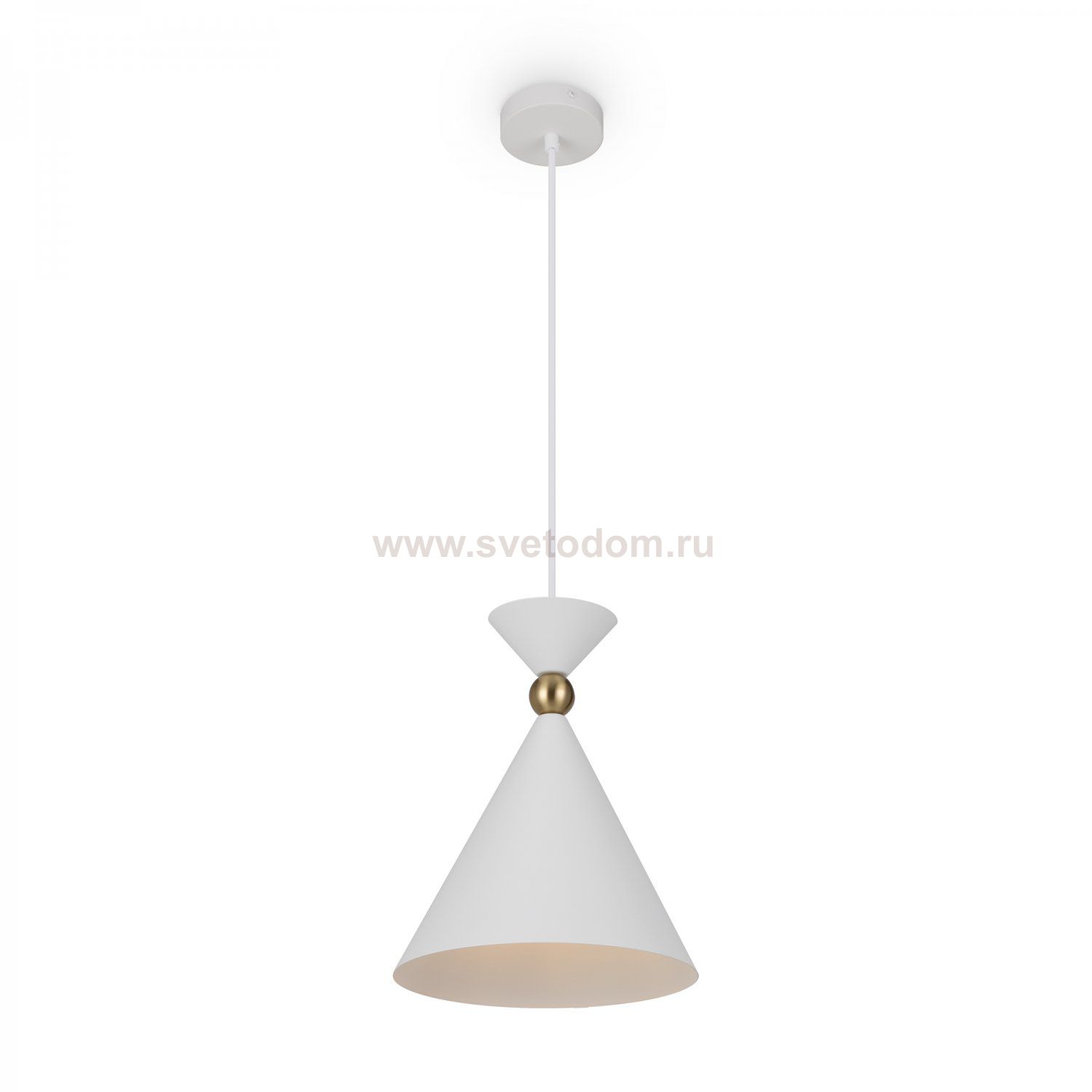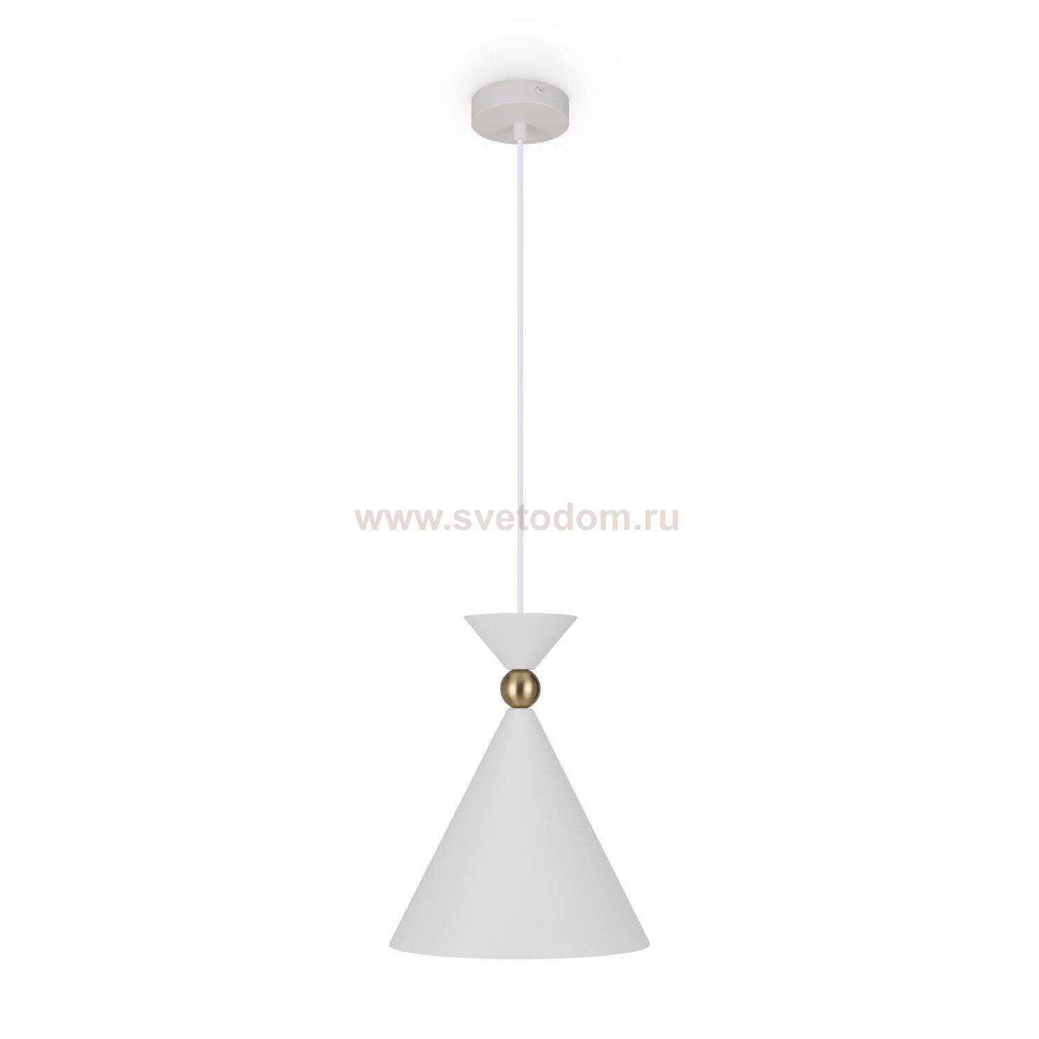 Арматура и плафоны из металла в двух цветах — белом и сером. Плафон состоит из 2-х конусов разных размеров, соединённых золотистым декоративным элементом. Высота регулируется. Идеальны для составления композиций. Источник света — лампа с цоколем Е27.