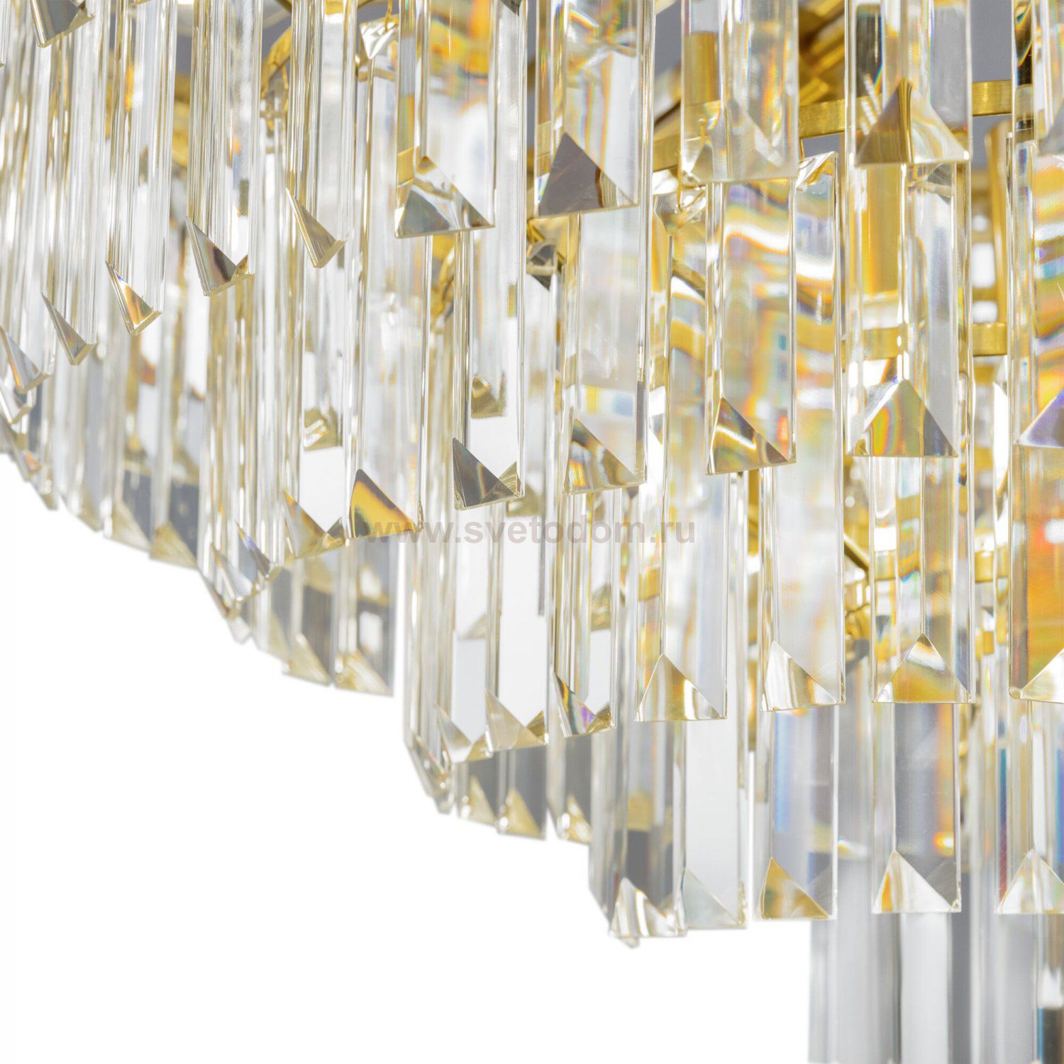 Арматура из металла в трех оттенках: латунь, хром, золото. Многоярусный декор. Подвески: прозрачное (арматура – хром, латунь) и янтарное (арматура – золото) стекло. Высота подвесных моделей регулируется.