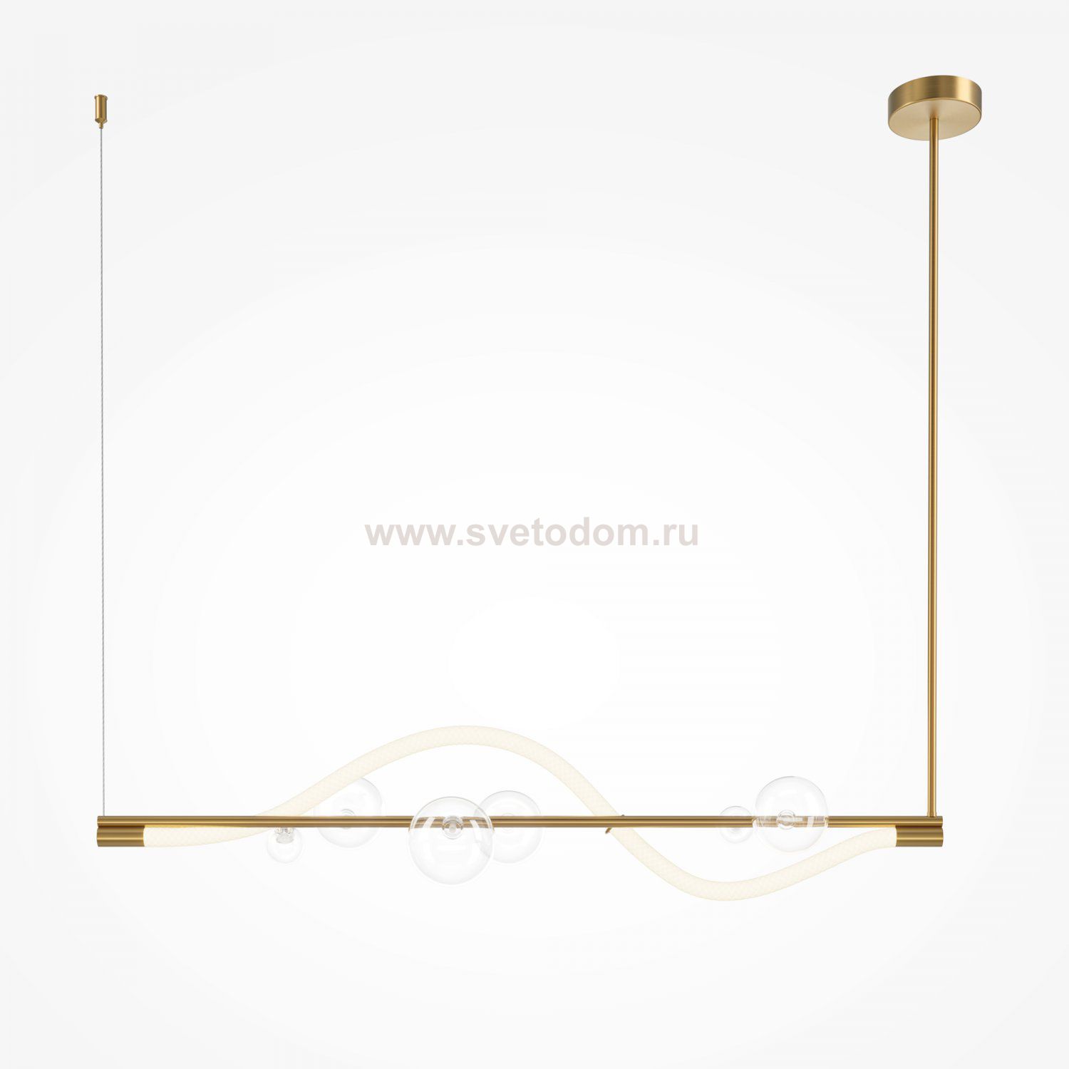 Арматура из металла цвета латуни, материал рассеивателя – текстильный жгут, декоративные элементы выполнены из прозрачного выдувного стекла. LED-источник света. Цветовая температура 3000К, угол рассеивания света 360°. Вертикальное настенное бра включается touch-сенсором. Тканевый шнур. Высота подвесных светильников регулируется.