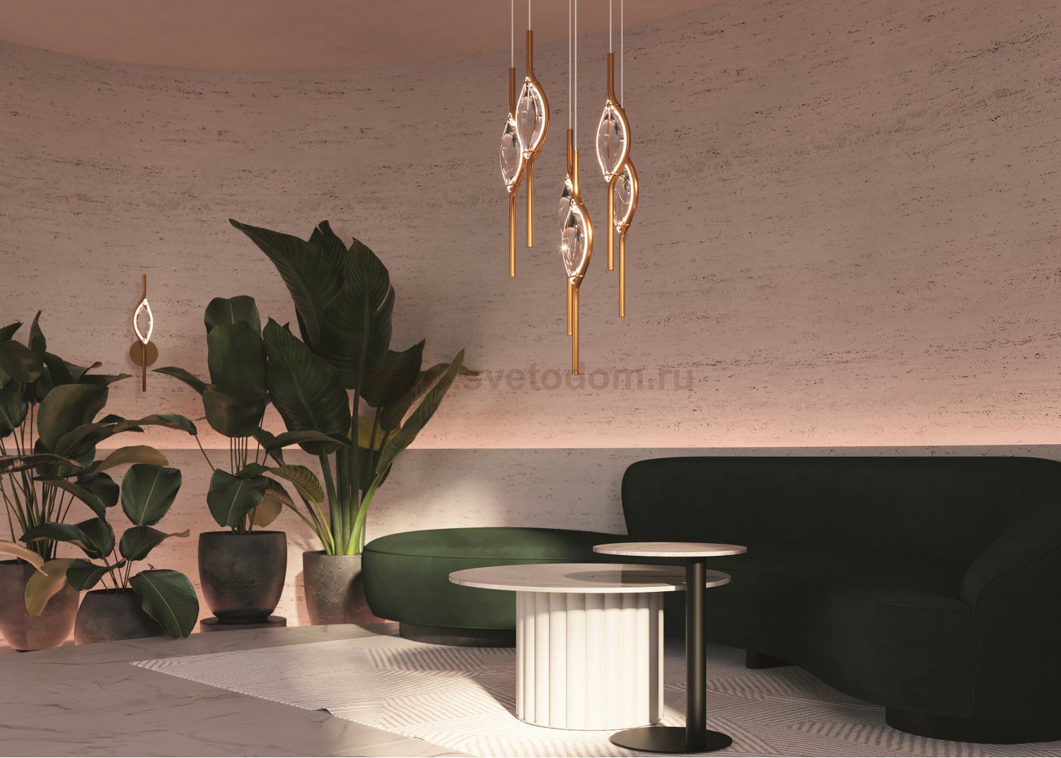 Алюминиевая арматура, цвет - латунь. Источник света: LED. Цветовая температура — 3000К, угол рассеивания — 120 градусов. Прозрачный рассеиватель из акрилового стекла. Светодиодный модуль установлен в обрамление из тонкой металлической арматуры.