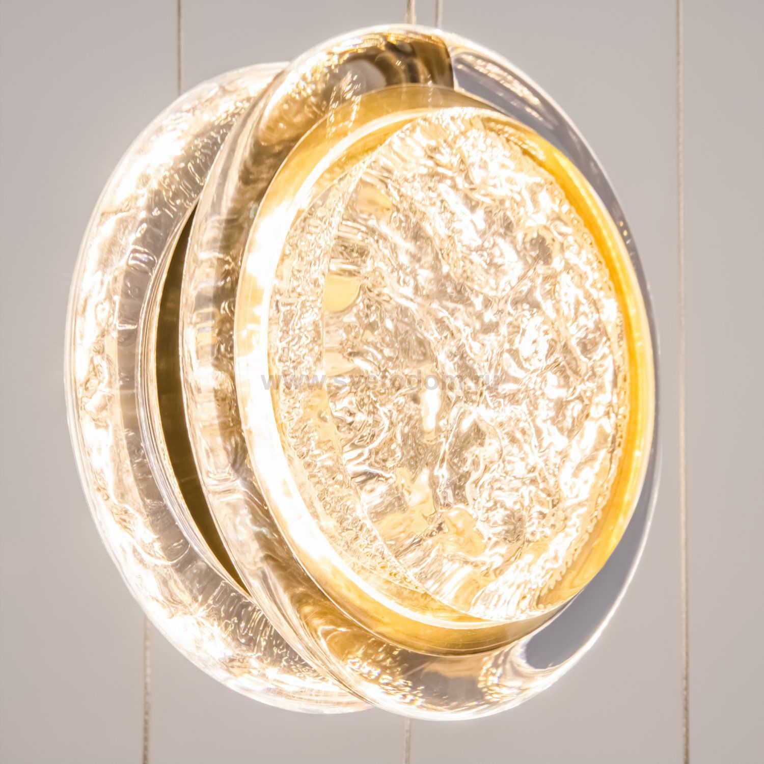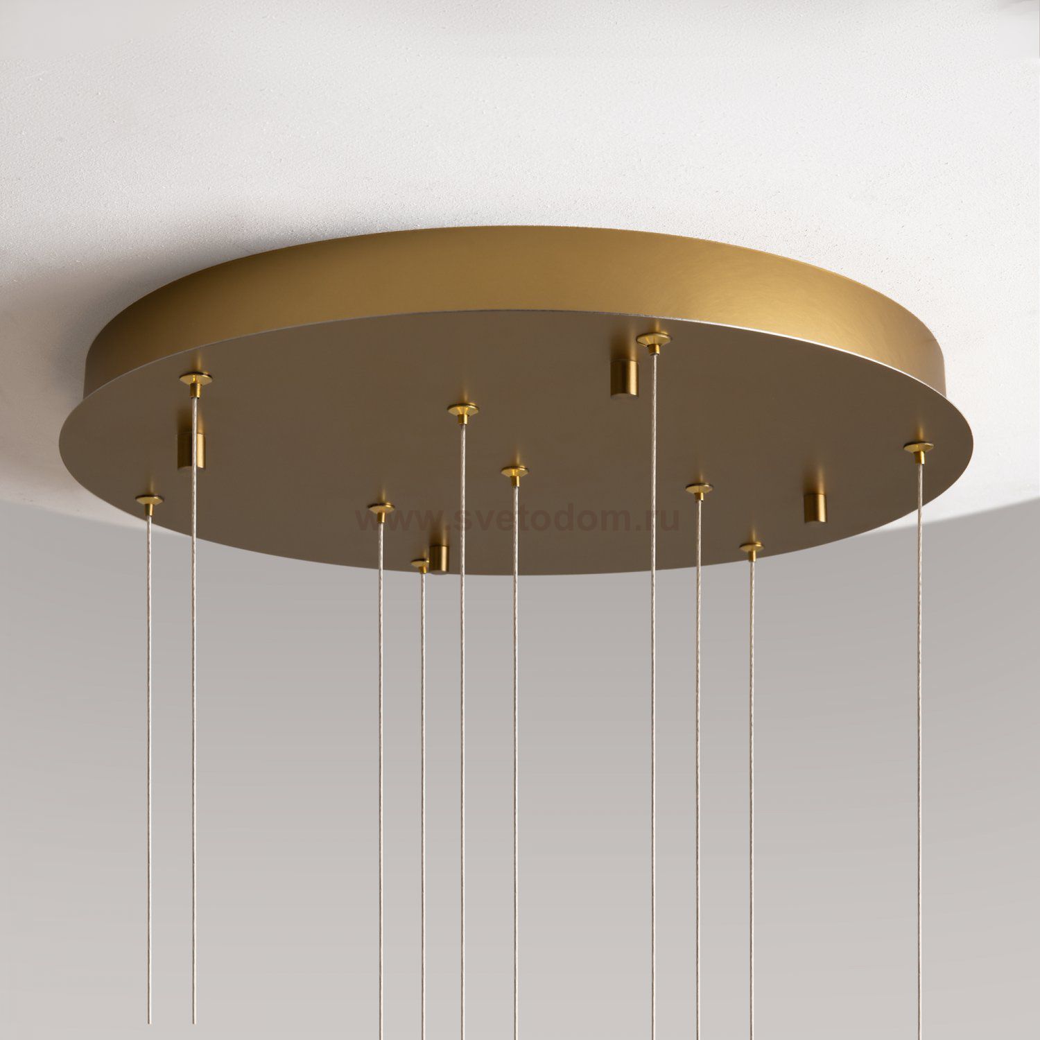 Арматура из металла цвета латунь с сатинированным финишным покрытием сочетается с прозрачными плафонами. Подвесные одинарные, горизонтальный и каскадные светильники оснащаются LED-модулем с двумя плоскими плафонами из акрила со сложным, актуальным паттерном на поверхности. Цветовая температура — 3000К, угол рассеивания — 125 градусов.