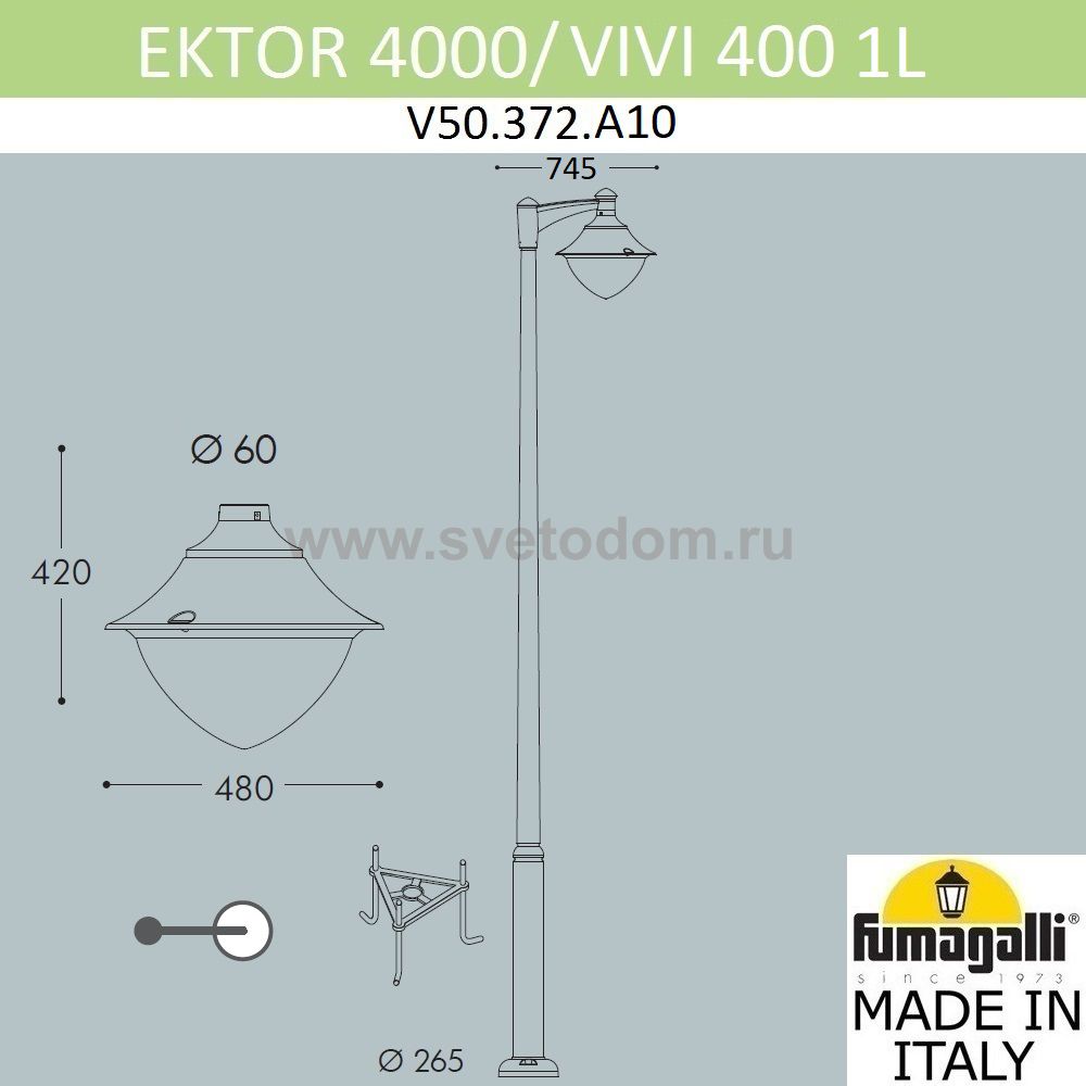 Касаемо артикула V50.372.A10.LXD6L важно знать - Парковый фонарь FUMAGALLI большого размера серии VIVI, модель EKTOR/MIDIPILAR/VIVI 1L. Светильник большого размера в современном стиле, который с помощью консоли MIDIPILAR установлен на классическом столбе EKTOR в положение "вниз. Предназначен для освещения парковых дорожек, cкверов, садовых и ландшафтных композиций, и других общественных пространств. Используется в качестве основного уличного освещения на городских улицах и площадях. Изготовлены в Италии, по уникальным технологиям "FUMATECH" из современного композитного полимера RESIN. Этот материал в 5 раз прочнее силумина, не ржавеет, не окисляется, не выгорает на солнце, его не нужно красить. Все светильники пыле-влаго защищены по стандарту IP65 (Пыленепроницаемые, защита от водяных струй с любого направления). Рассеиватель выполнен из антивандального, не мутнеющего и не горючего PMMA (ПолиМетилМетаАкрилат). Срок службы светильника - не менее 20 лет. Температура использования от -60 до +90. В серии VIVI есть ландшафтные фонари в настенном (MIDIPILAR/VIVI) и наземном исполнении (NEW LOT/VIVI, AKILLE/VIVI) со столбами разной высоты, с разным количеством и конфигурацией голов. Фонари на консолях и кронштейнах освещения устанавливаются только в положение "вниз". Столбы имеют в основе мощную стальную трубу с двойной оцинковкой и монтажный люк. Закладные элементы- в комплекте. Для устройства подвесного ландшафтного освещения предлагаем купить модель LUIGI 400-DR HIGH POWER LED с возможностью регулирования подвеса на любой высоте. При заказе требуется выбрать цвет корпуса, цвет плафона и тип ламп ("FUMAGALLI" E27 HIGH POWER LED 50W или матрицу "FUMAGALLI" GX-53 10W 1200Lm x 6).