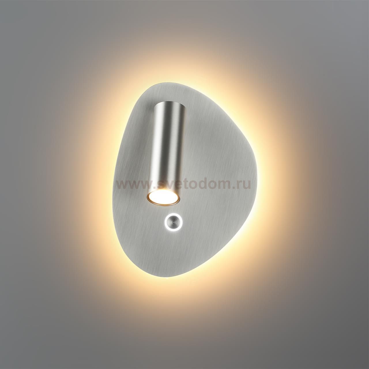 Roy — стильный светильник в цвете брашированного никеля с сенсорным управлением, объединяющий точечный спот и мягкую заднюю подсветку. Оригинальная ассиметричная форма вдохновлена природой, технология touch switch позволяет включать светильник, раздельно включать зоны света и переключать цветовую температуру — от тёплого до нейтрального (2700K/3300K/4000K), а также диммировать свет долгим нажатием.