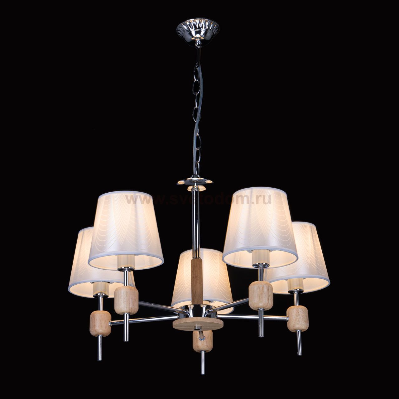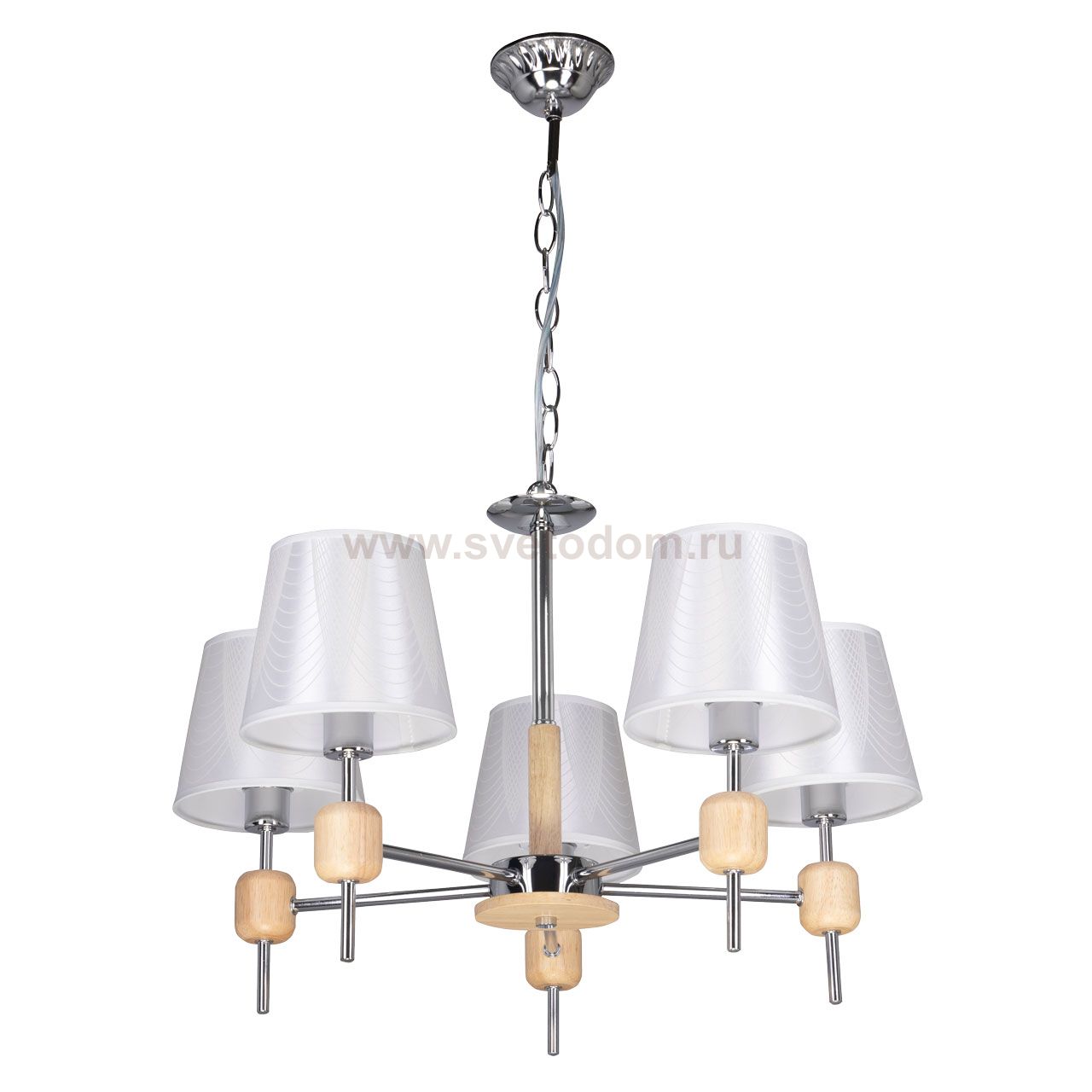 Металлическое основание светильника гальванизировано в цвет хрома. Светильник декорирован текстильными абажурами белого цвета с термостойким акрилом внутри. Подвесная люстра декорирована элементами из массива дерева натурального цвета. Комментарий