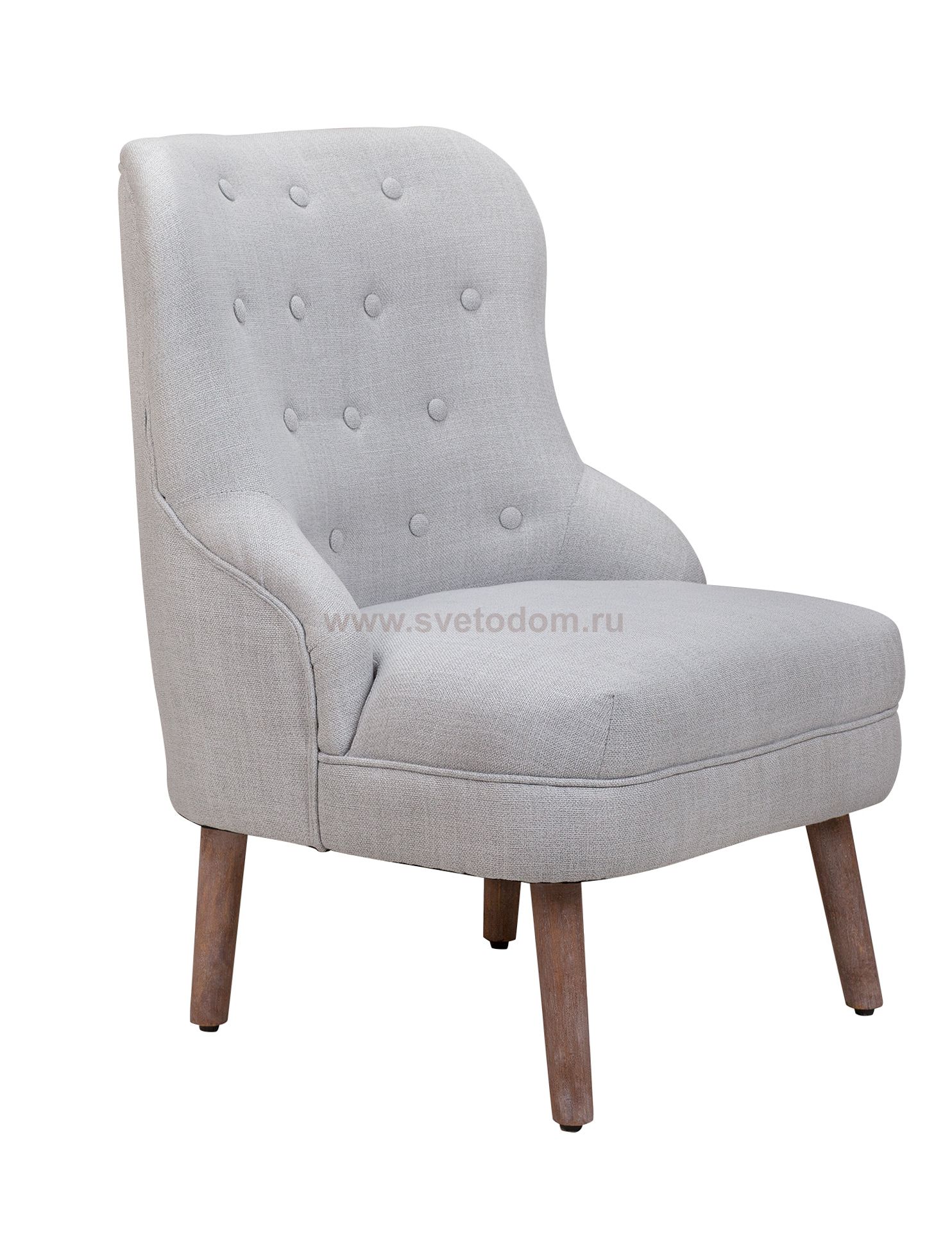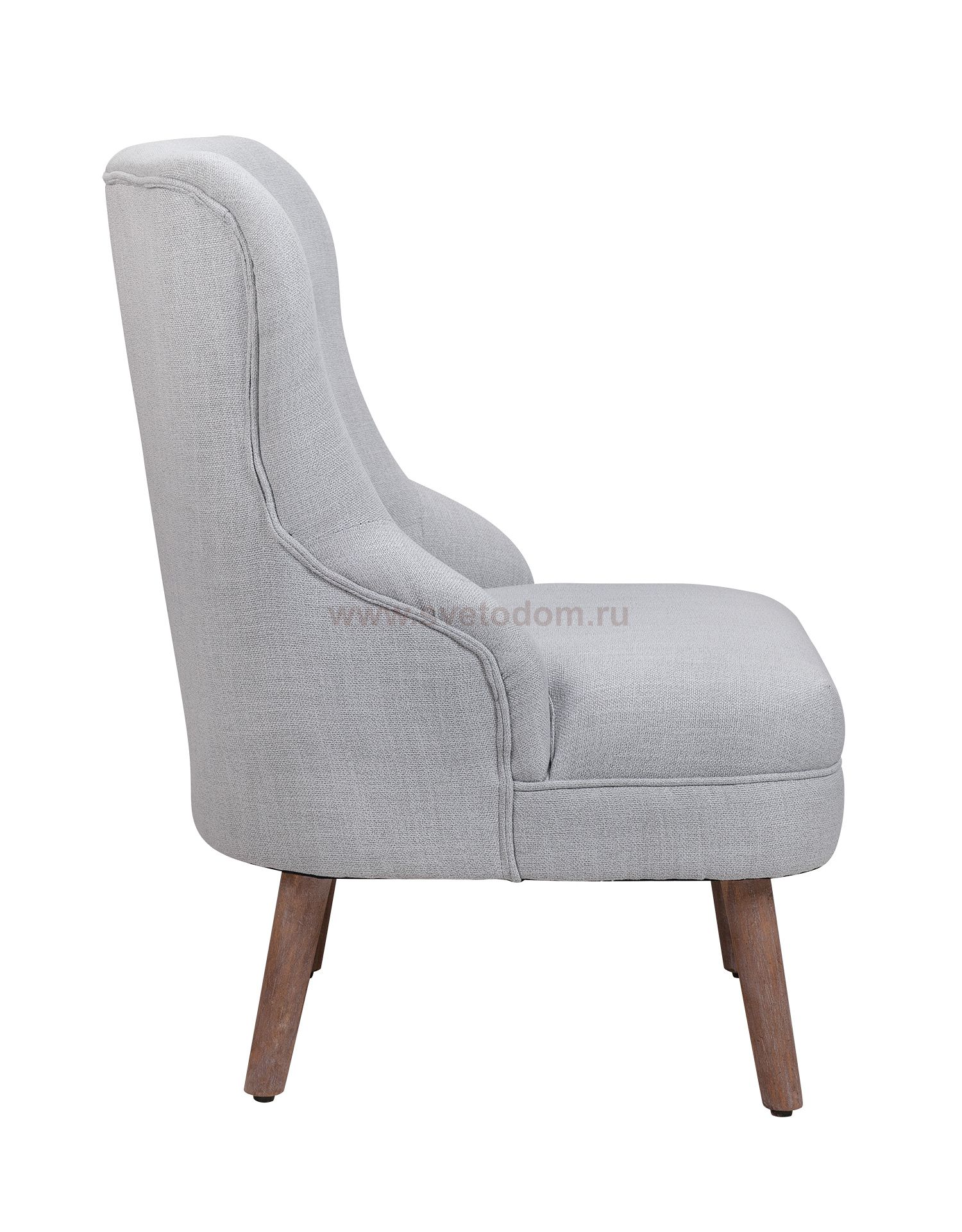 Кресло Erwin gray на длинных деревянных ножках, с каркасом из каучукового дерева и прочной, износостойкой обивкой серого цвета. Спинка, декорированная мебельными пуговицами, закругляется по бокам и плавно переходит в небольшие подлокотники.
