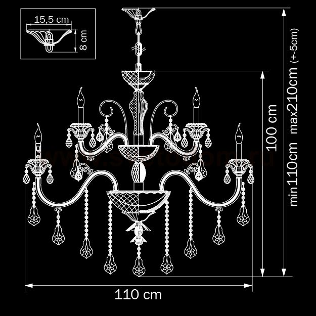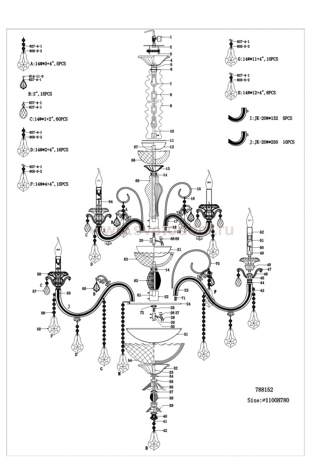 Высота min-max (см): 110-210; Ширина (см): 110; Вес (кг): 54,45; Кол-во ламп: 15xE14; Мощность max (W): 60; Цвет основания/цвет стекла или абажура: Gold/ Cristal gold;