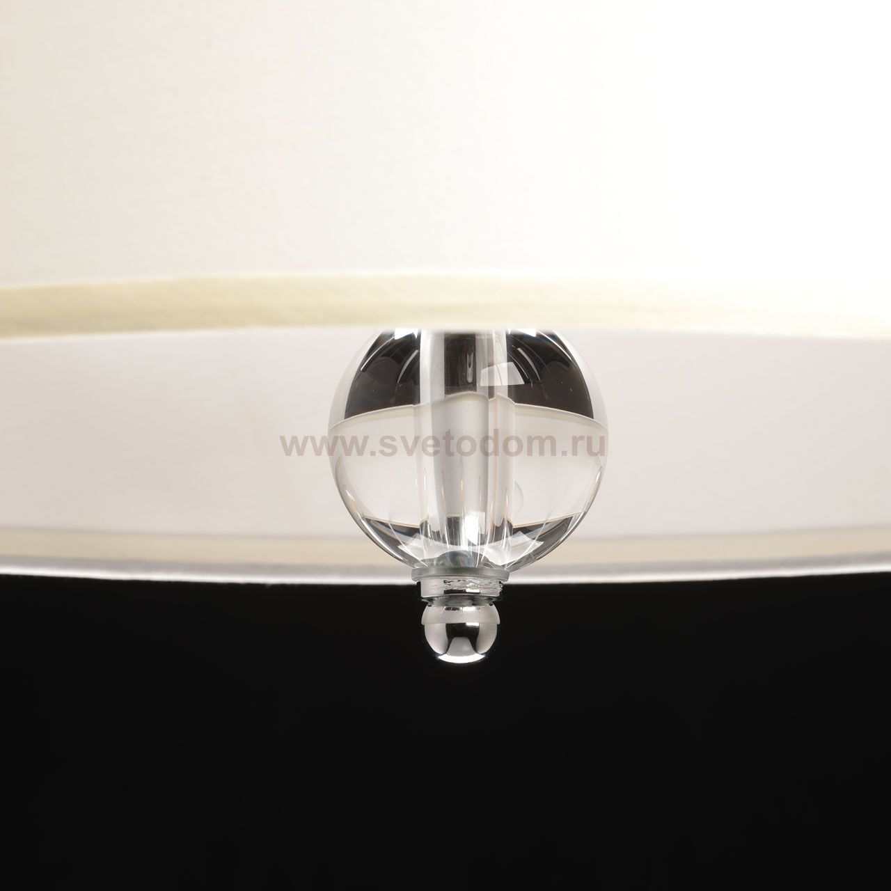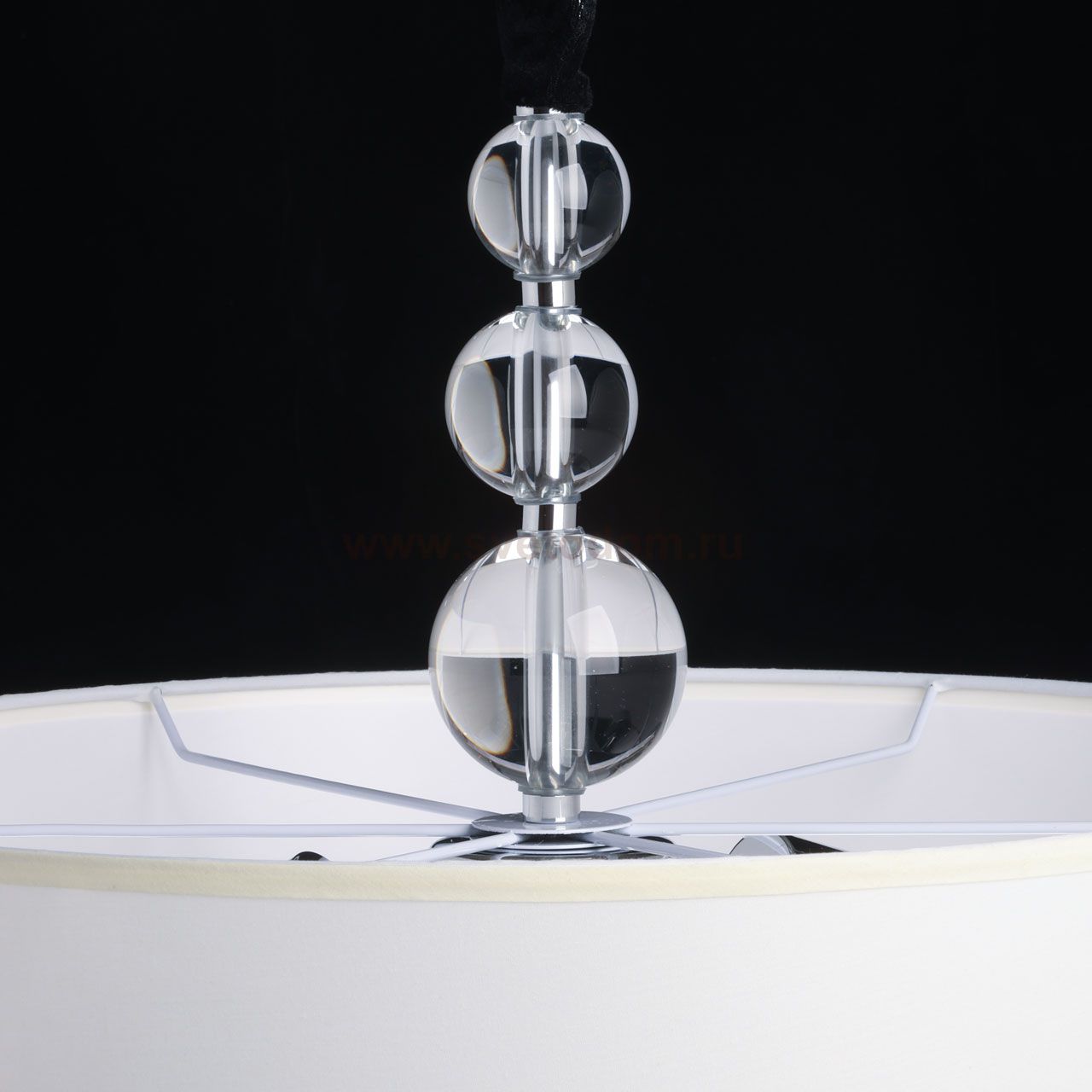 Металлическое основание светильника гальванизировано в цвет хрома. Источники света закрыты белым текстильным абажуром с термостойким акрилом внутри. Центральная ось светильника декорирована сферами из прозрачного массива хрусталя. Комментарий
