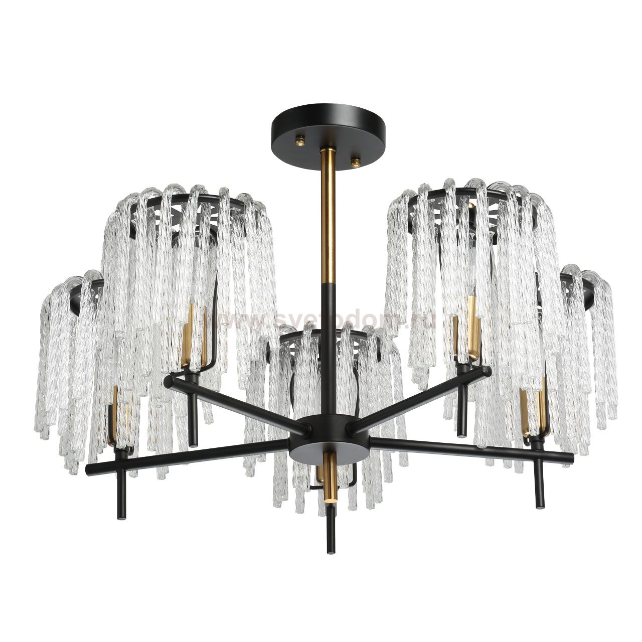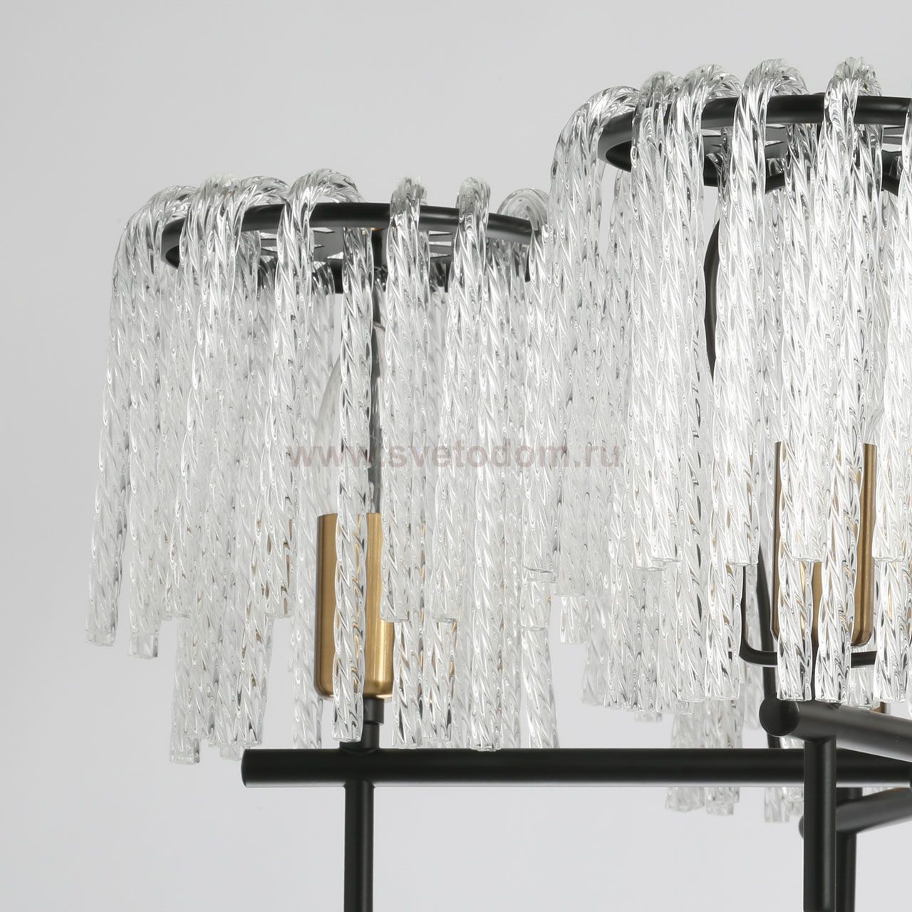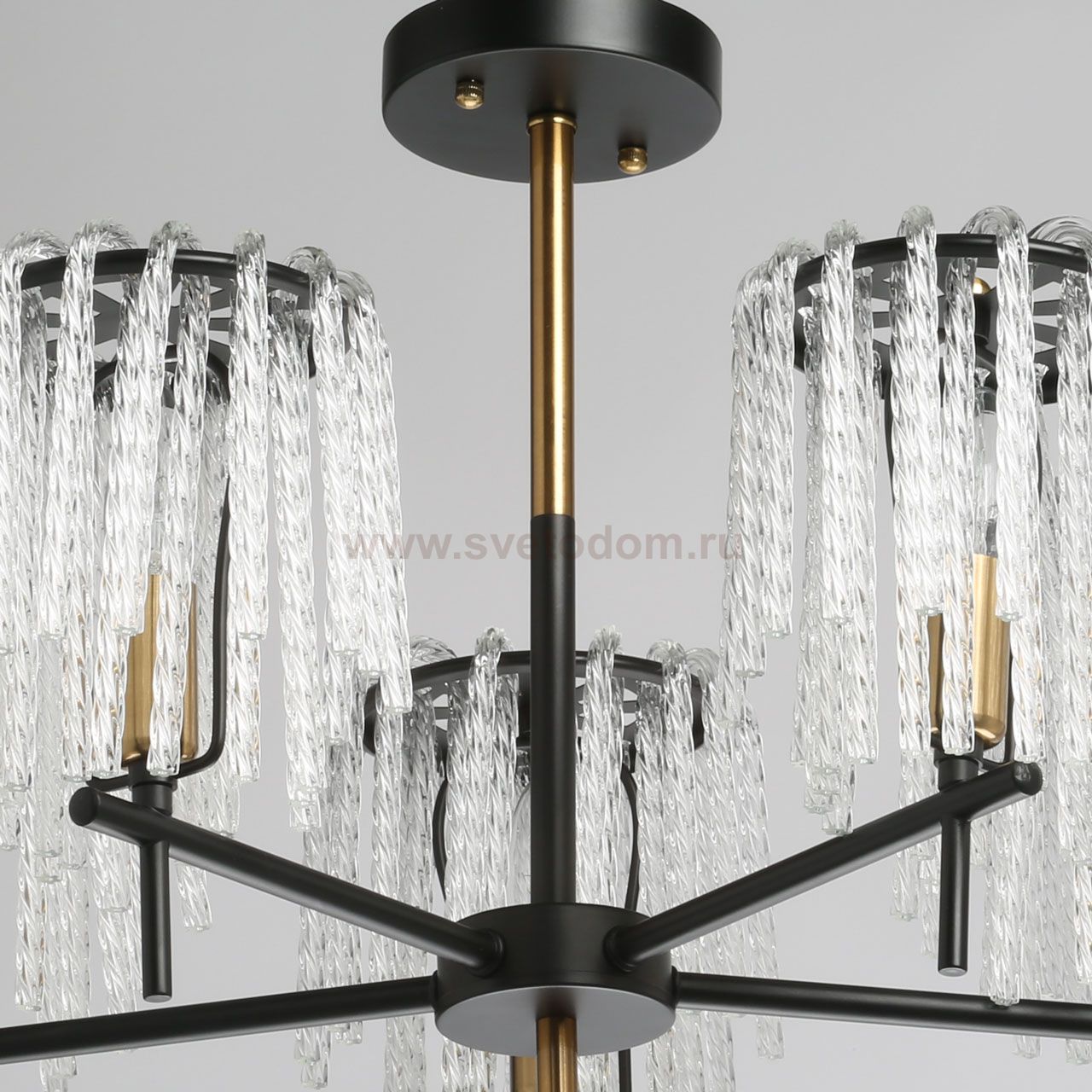 Металлическое основание окрашено в черный цвет. Отдельные элементы светильника гальванизированы в цвет бронзы. Светильник декорирован прозрачными стеклянными извитыми элементами. Комментарий