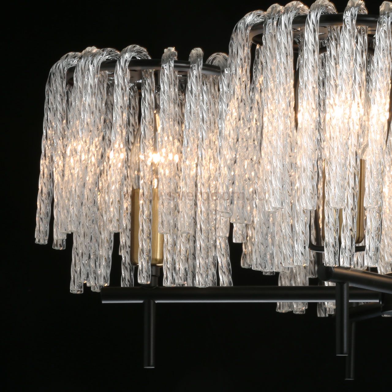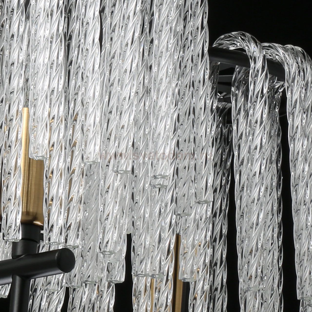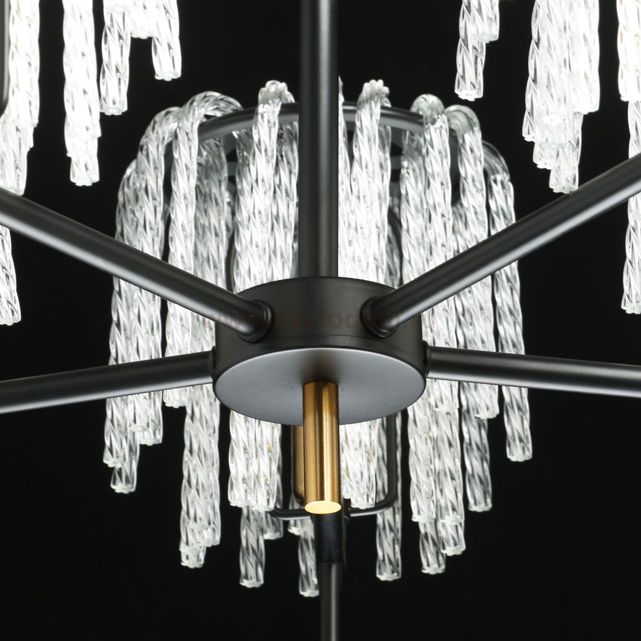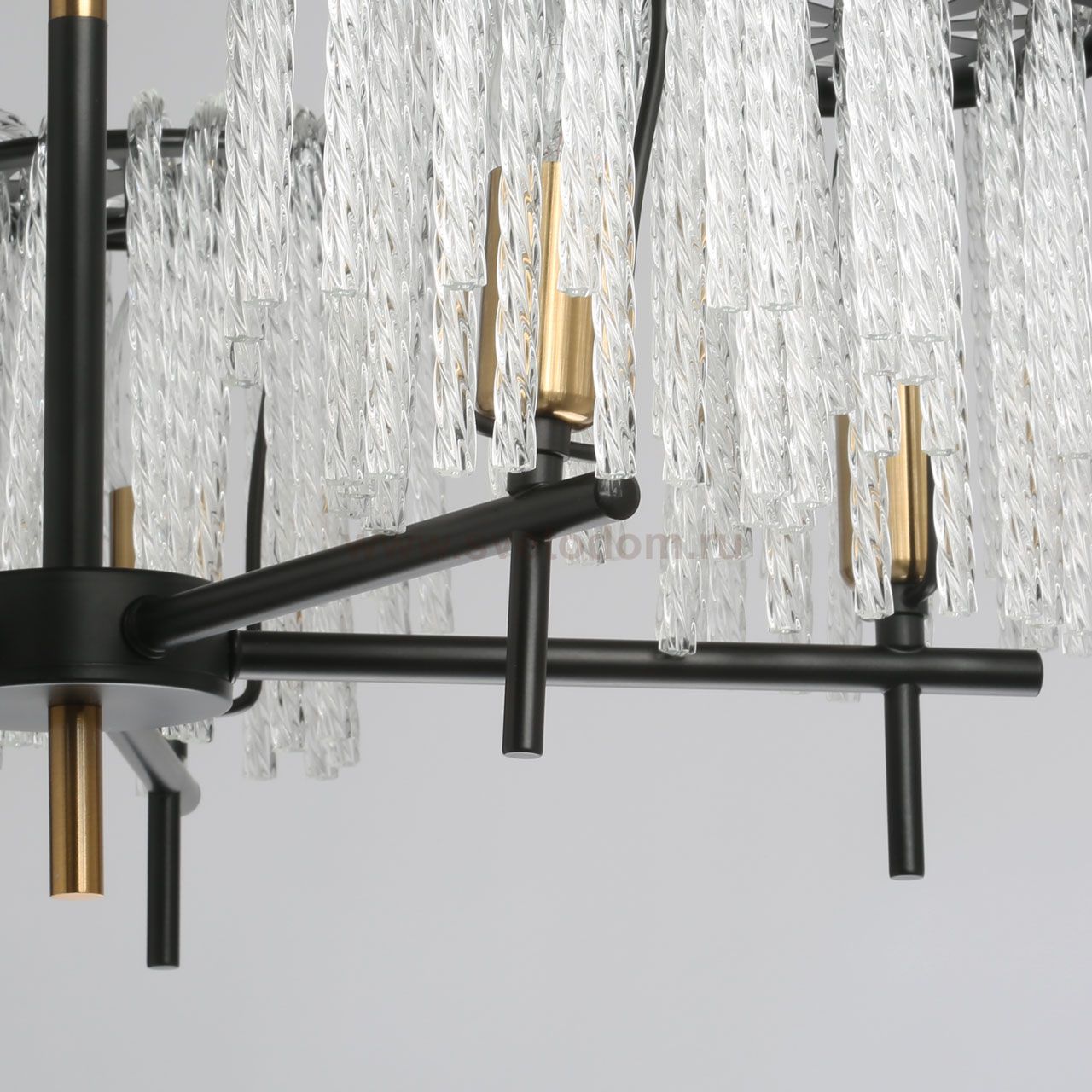 Металлическое основание окрашено в черный цвет. Отдельные элементы светильника гальванизированы в цвет бронзы. Светильник декорирован прозрачными стеклянными извитыми элементами. Комментарий