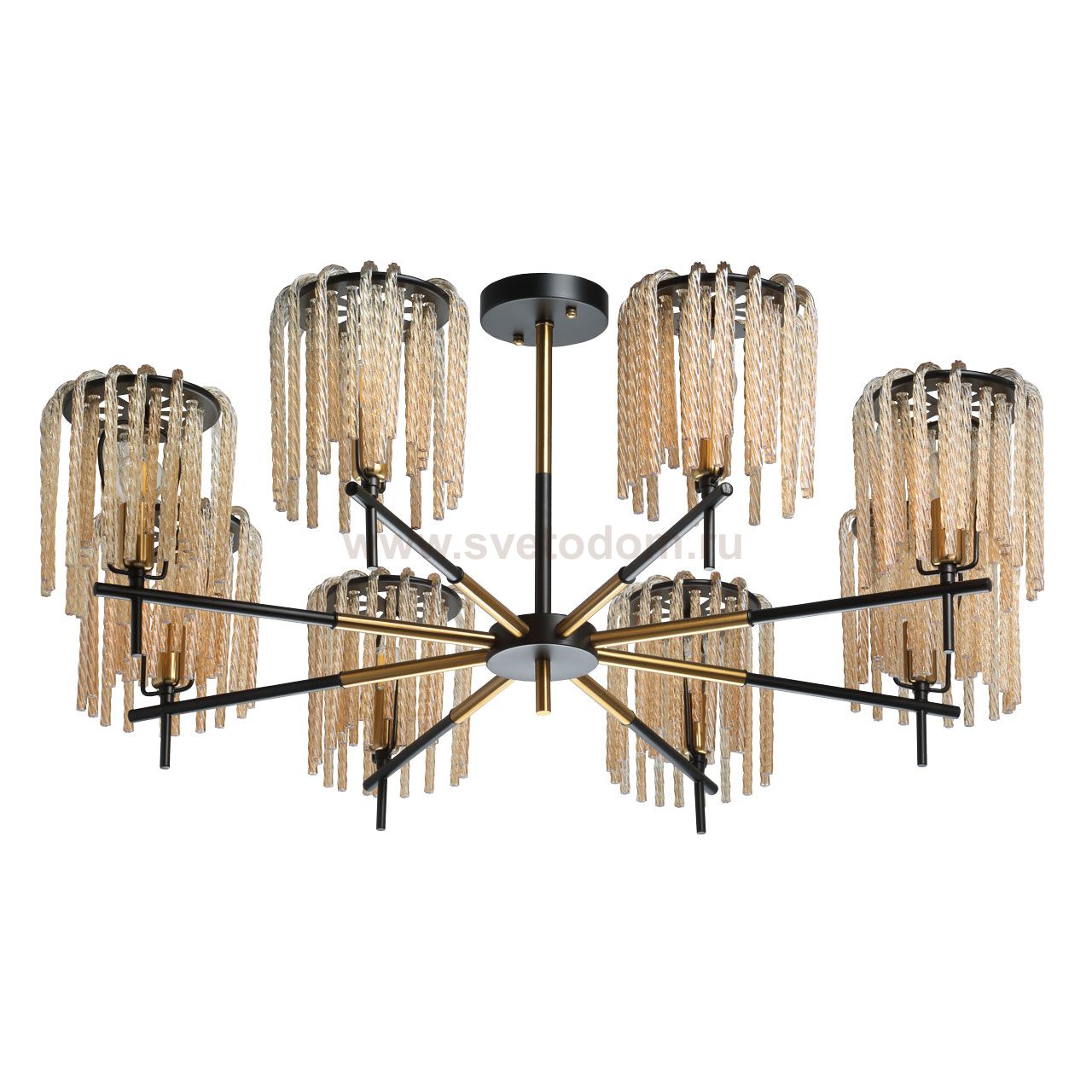 Металлическое основание окрашено в черный цвет. Отдельные элементы светильника гальванизированы в цвет бронзы. Светильник декорирован стеклянными извитыми элементами, гальванизированными в цвет топаз. Комментарий