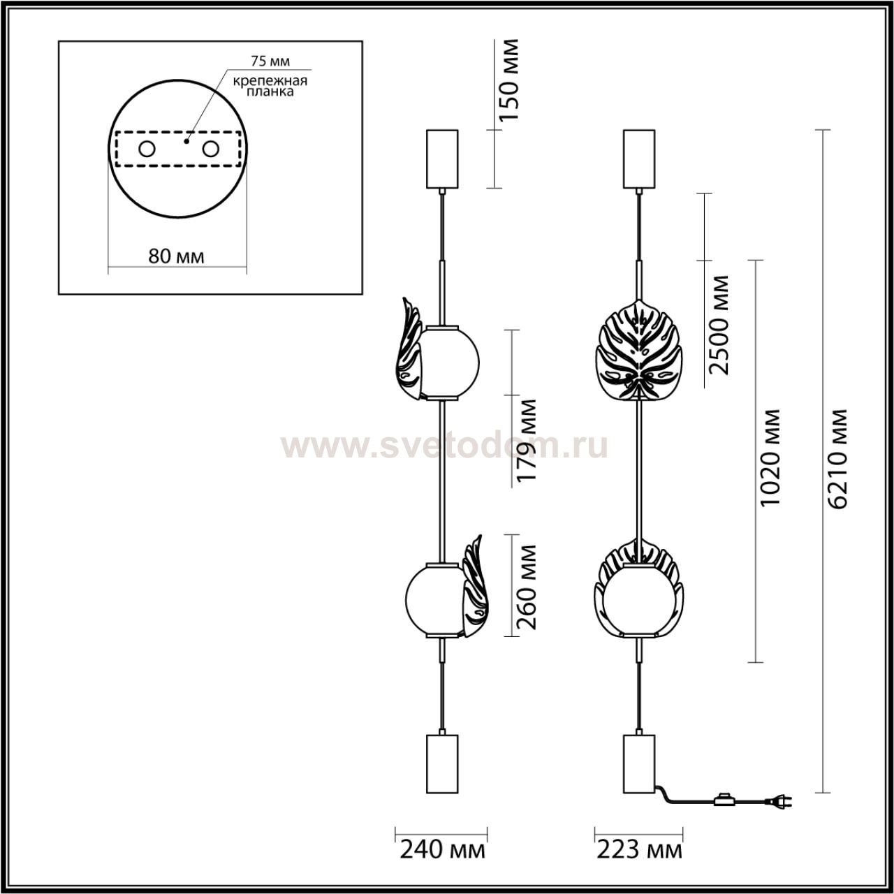 Линия Jungle выполнена в стиле эко-роскошь или эко-шик, для которых характерны природные мотивы и роскошное декорирование в виде золотого и серебряного покрытия. В качестве главного декоративного элемента в серии выступает стилизованный лист монстеры, покрытый золотым или серебряным фольгированием. Особое место в линии Jungle занимает натяжной торшер, при помощи которого можно сделать световой акцент, зонирование пространства, эффектное украшение и комфортное освещение интерьера одним светильником! Высоту торшера можно менять с помощью регулировки длины провода. Коммутацию торшера можно осуществлять как с потолка , так и вынести через нижнюю чашу провод с выключателем (оба варианта коммутации идут в комплекте).