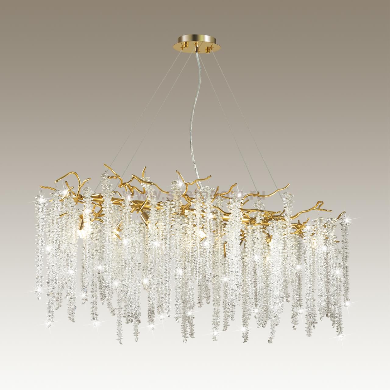 Линия Banche — это природные мотивы, изящество линий и многообразие форм, выраженных в моделях люстр и настенных светильников. Множество свисающих подвесок из плотно нанизанных переливающихся хрустальных бусин, словно «сережки» на изогнутых ветвях плакучей ивы. Арматура в золотом цвете выполнена из алюминия. Аккуратная точечная сварка фиксирует соединения. Ручным способом можно формировать «крону» люстр и бра, подгибая и выпрямляя ветви. В линии есть потолочная и подвесная круглые люстры, овальная люстра и бра. Популярная сейчас овальной формы модель предназначена для размещения над обеденной зоной.