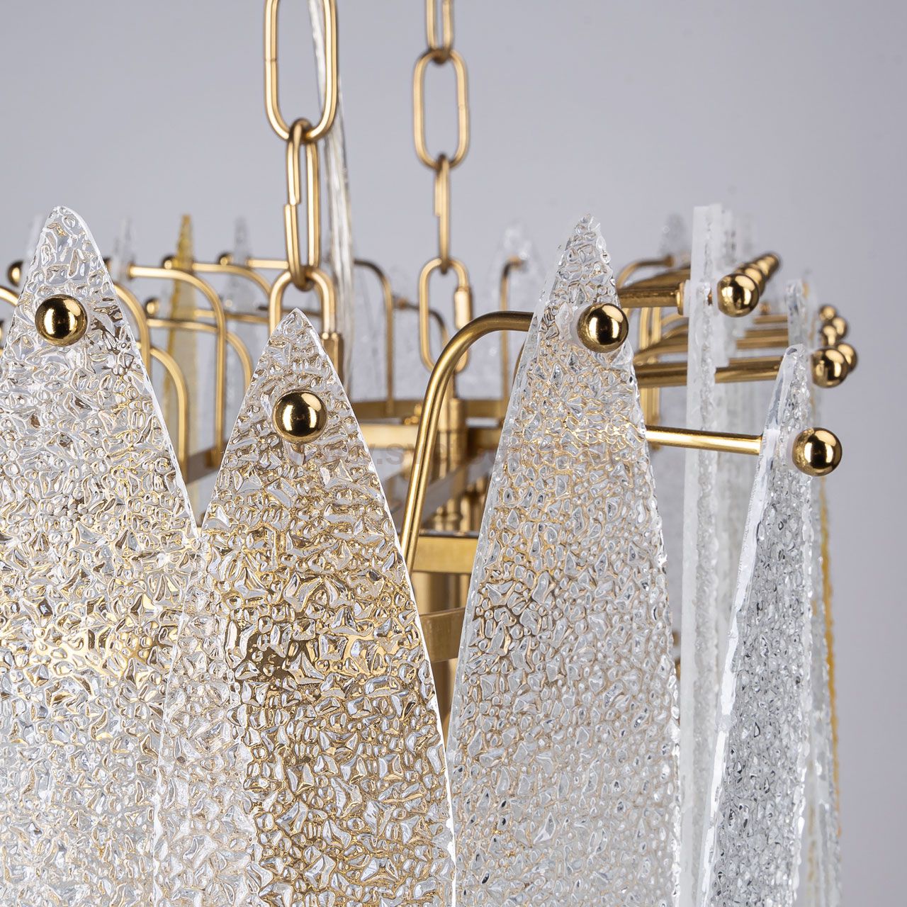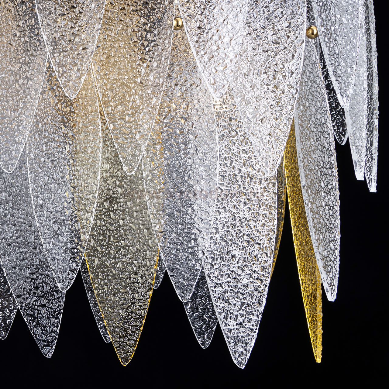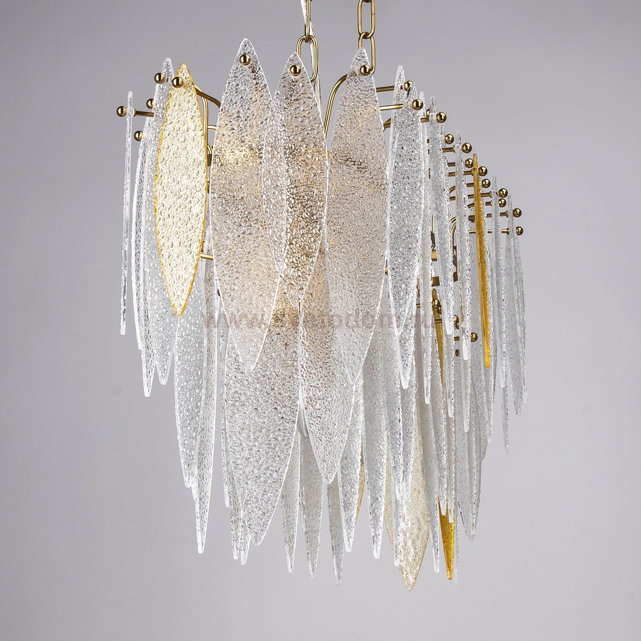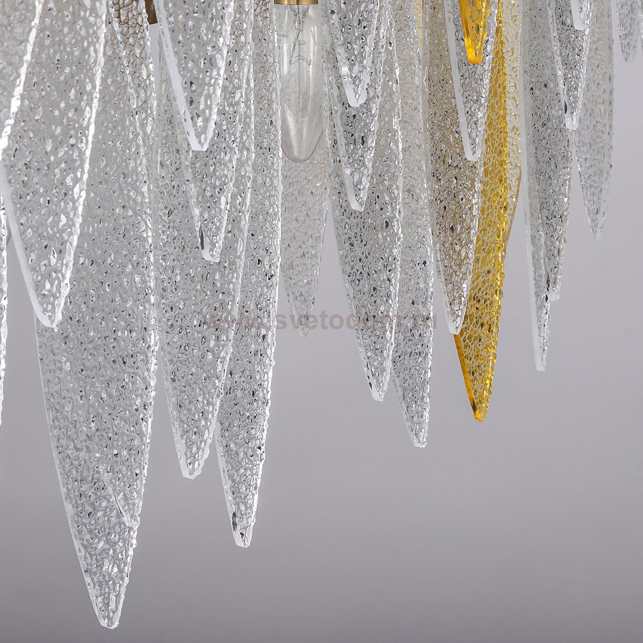 Металлическое основание подвесного светильника гальванизировано в цвет латуни. Люстра декорирована фактурными стеклянными пластинами прозрачными и цвета шампань. Комментарий