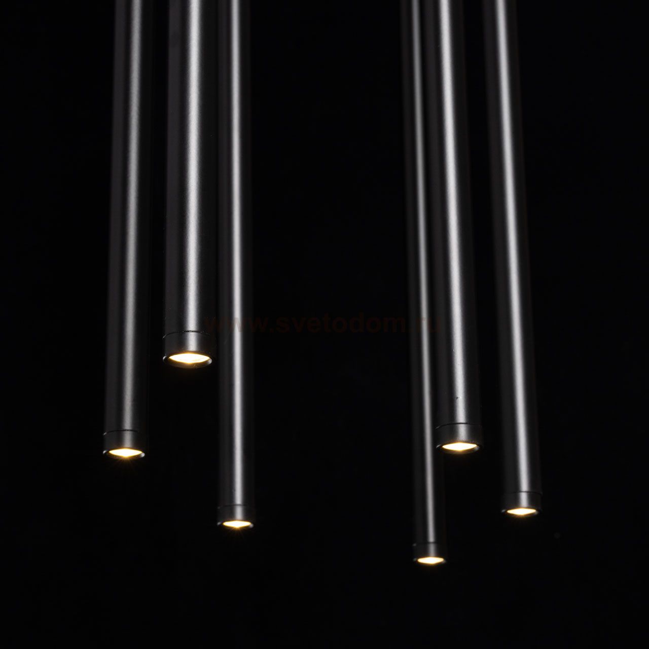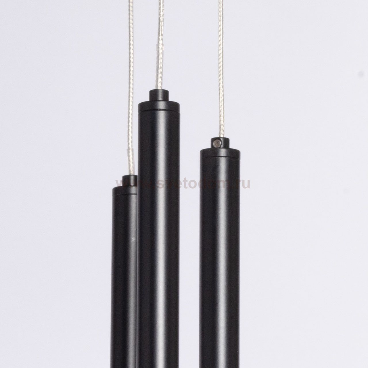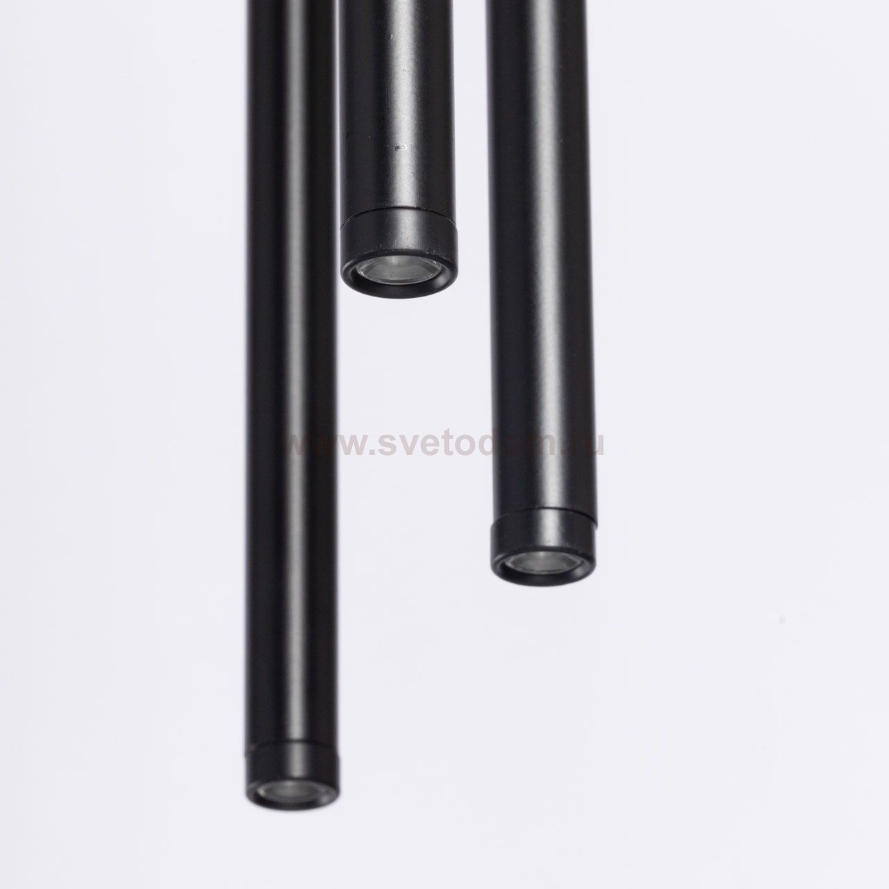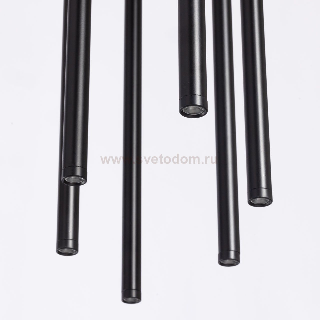 Металлическое основание люстры окрашено в черный матовый цвет. Корпус плафонов выполнен из сплава алюминия с цинком и окрашен в цвет основания. Светодиодный источник света закрыт прозрачным акрилом. Комментарий