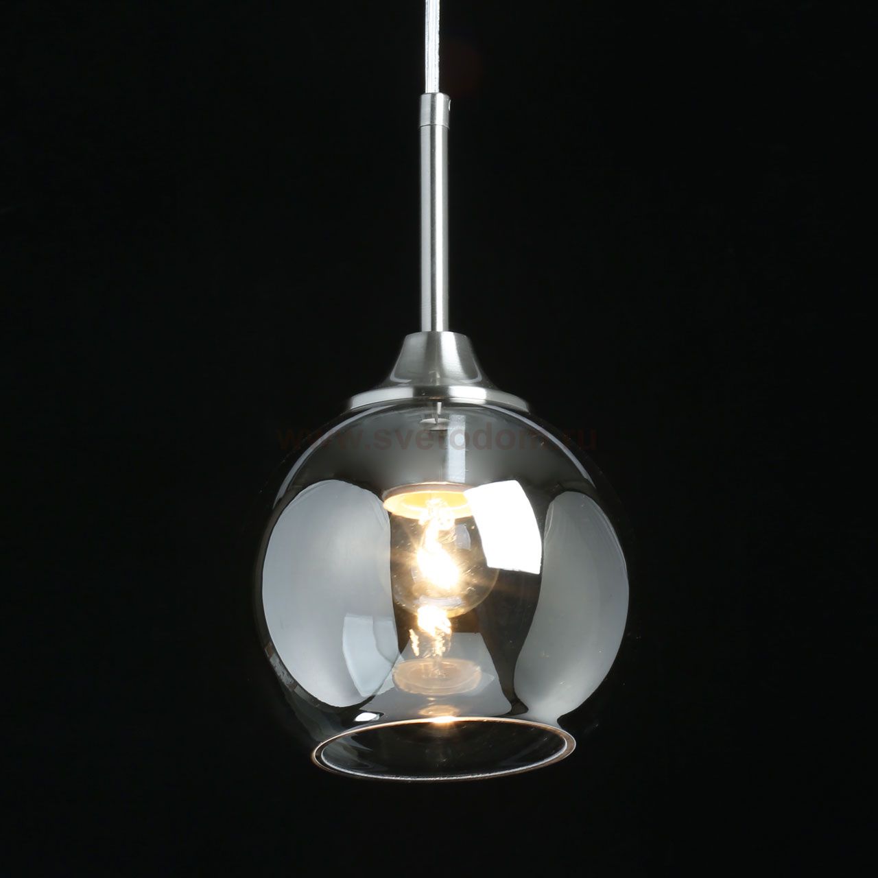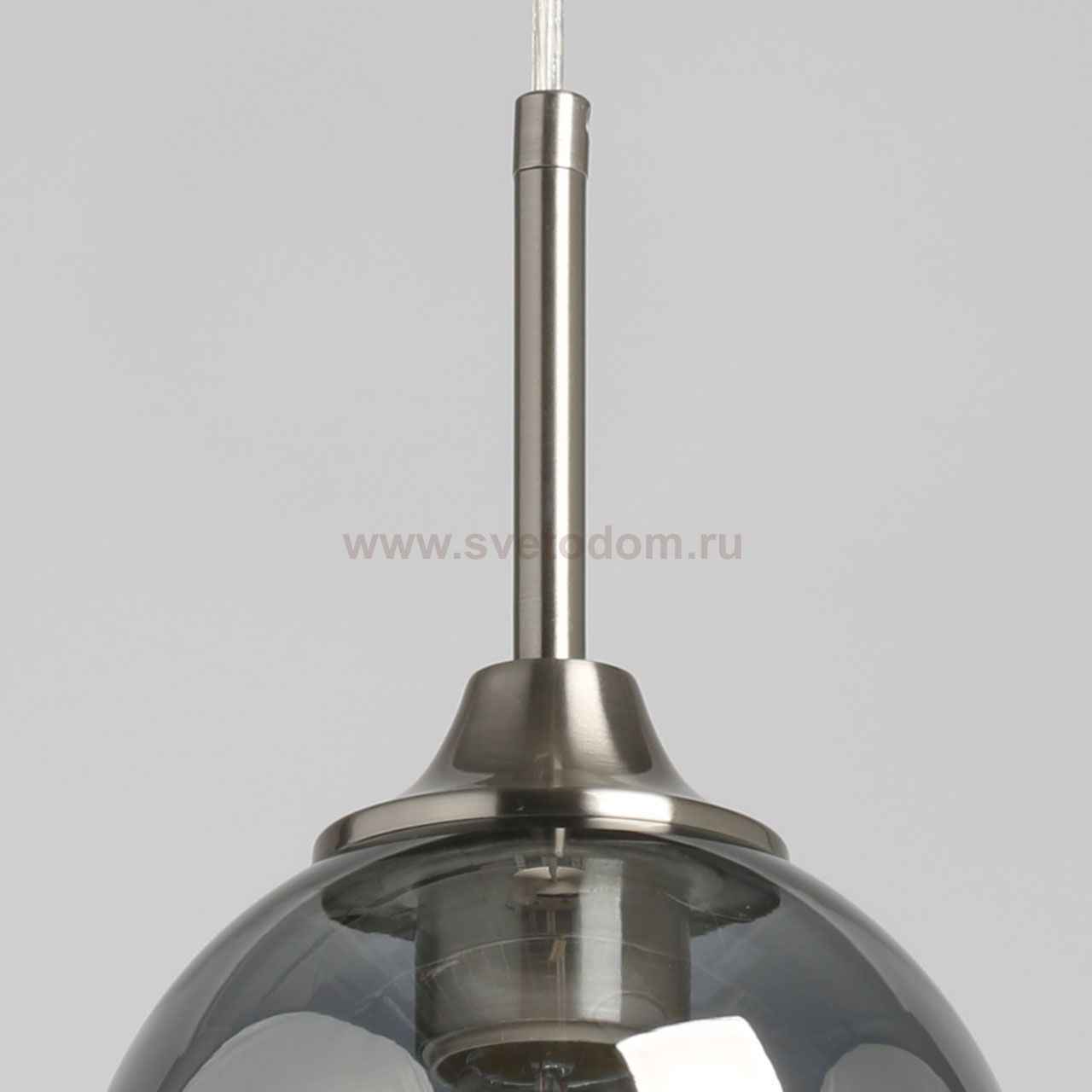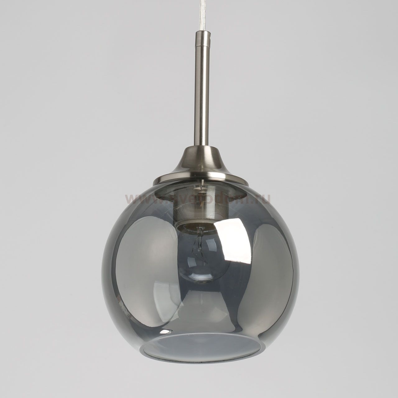 Металлическое основание подвесной люстры гальванизировано в цвет никеля. Стеклянный плафон ручной выдувки гальванизирован в дымчатый цвет. Комментарий