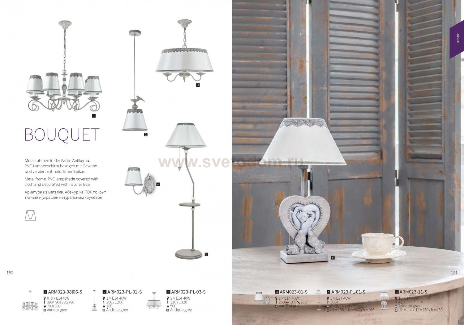 Особенности модели ARM023-PL-01-S: Серия светильников Bouquet создана для тех, кто стремится привнести в интерьер нотки деревенского шарма, сохранив при этом изящность и благородство интерьера. Арматура светильников сделана из металла и выкрашена в серый цвет. Краска намеренно положена неравномерно, а с имитацией естественных потертостей. Абажуры из хлопка на ПВХ с кружевными бордюрами. Светильники серии дополнены декоративными деталями в виде рамки для фотографий у настальной лампы и фигурок птиц у бра и подвесного светильника.