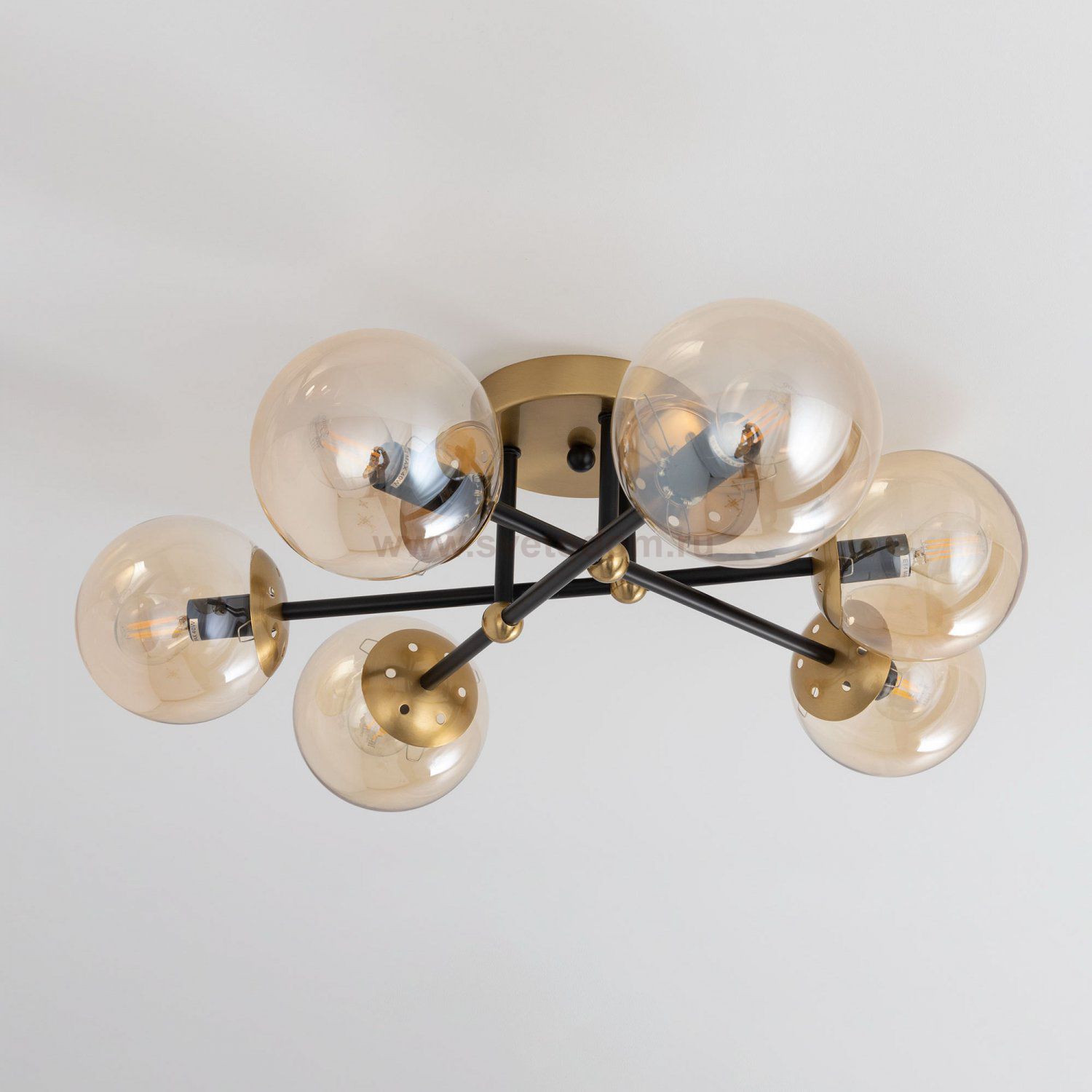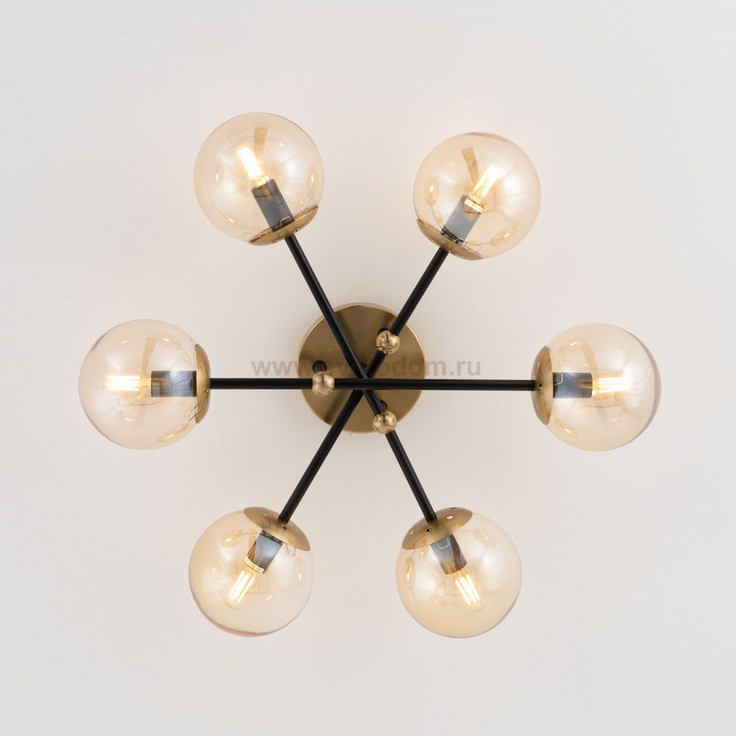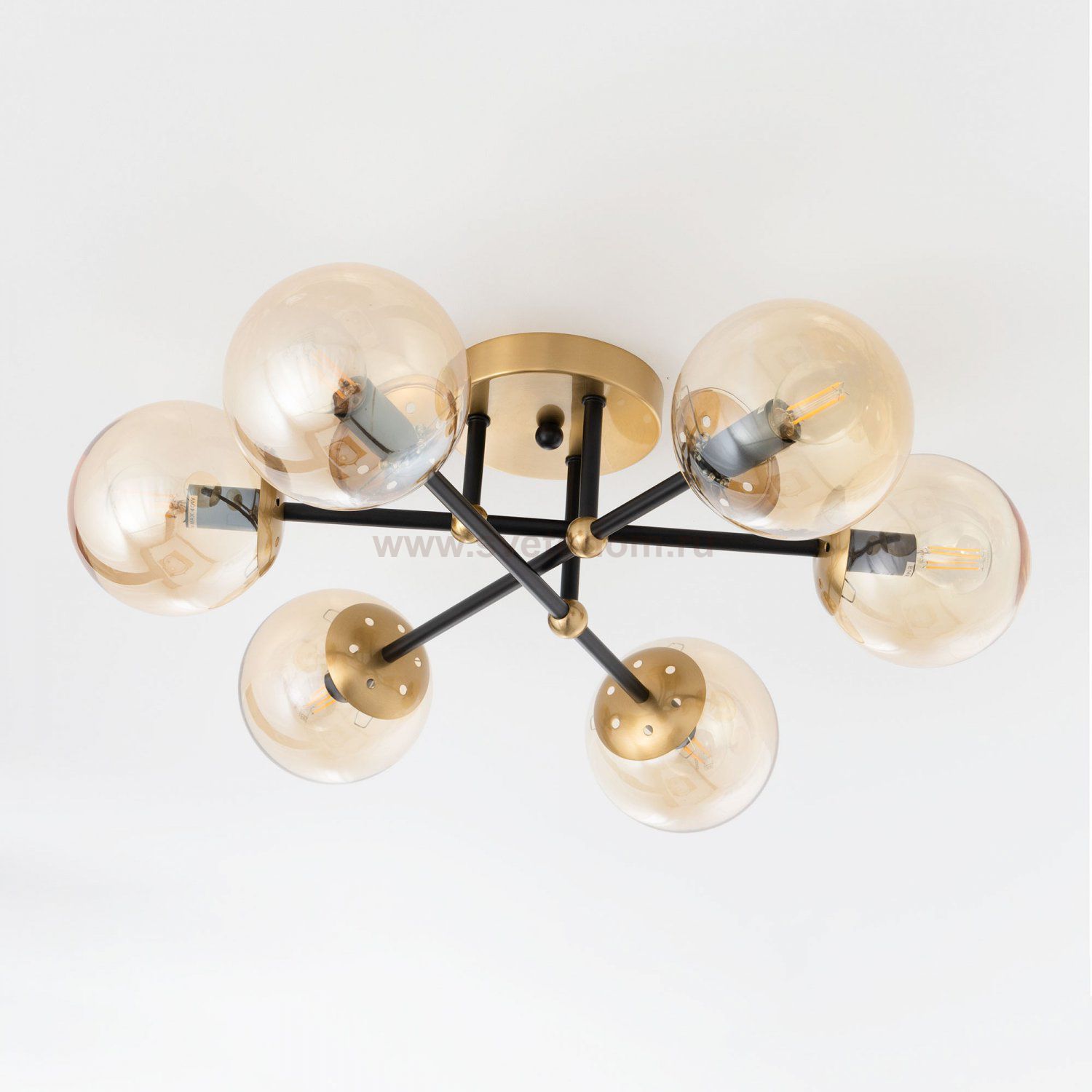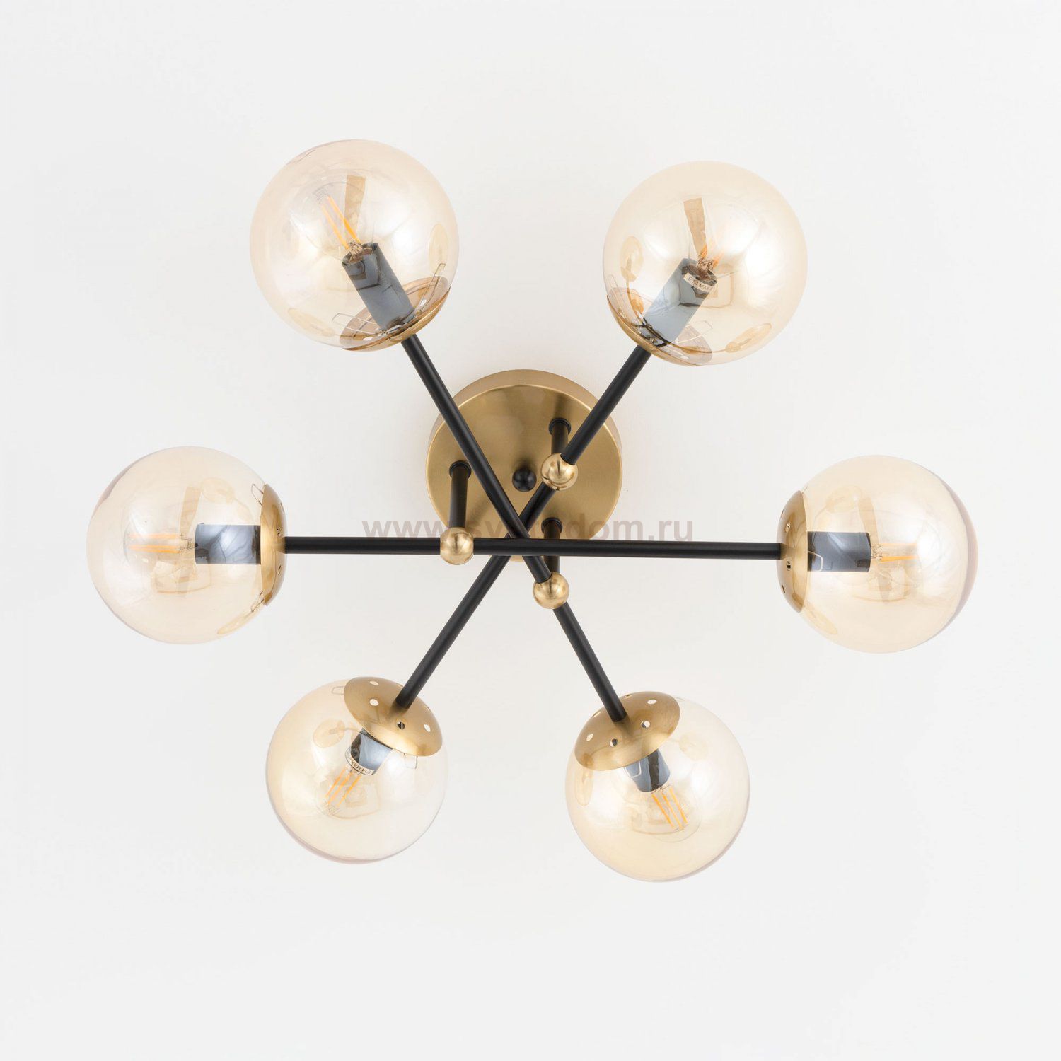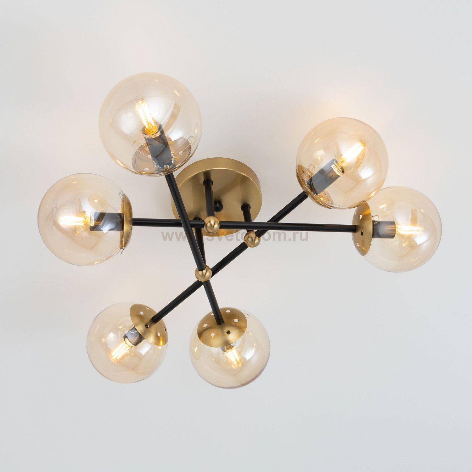 Стильная потолочная люстра Citilux Памела CL144165 для модных интерьеров, оформленных в стиле сканди, модерн или лофт. Корпус светильника металлический, цвет – сочетание чёрного и бронзы. Основание круглое, рожки-штанги расположены параллельно потолку. Плафоны в форме шара, изготовлены из прозрачного стекла светло-янтарного оттенка. В изделии используются 6 ламп с цоколем Е14, максимальной мощностью для ламп накаливания 40Вт. Светодиодные лампы можно устанавливать более яркие. Подходит для всех типов потолков, в том числе натяжных, тип крепления – планка.