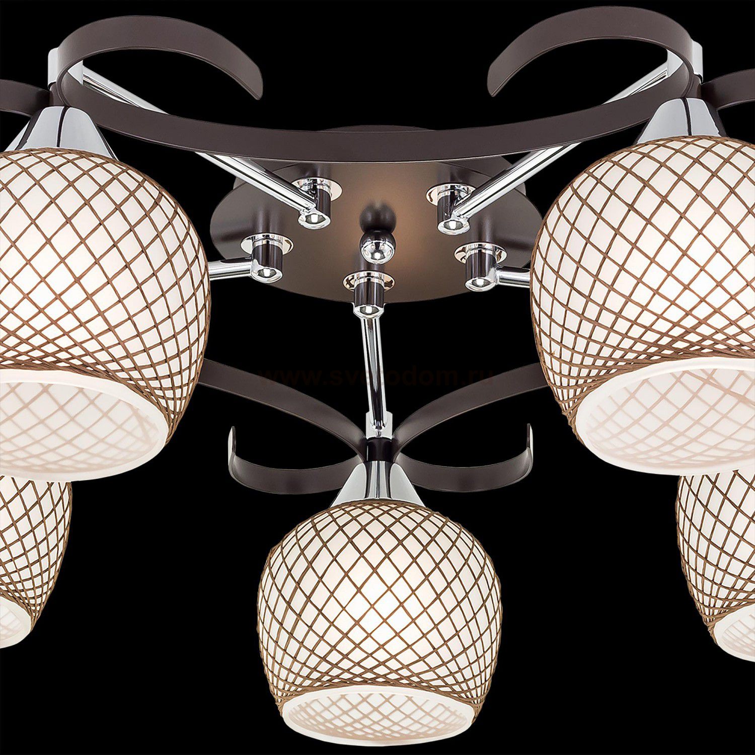 Потолочная люстра с 5-тью рожками из изящной коллекции «Сюзи». Металлическая конструкция люстры со стеклянными плафонами, ажурно оплетенными необычным тканевым узором, делающим светильник в буквальном смысле слова «вязаным» создаст атмосферу уюта и комфор Технические особенности