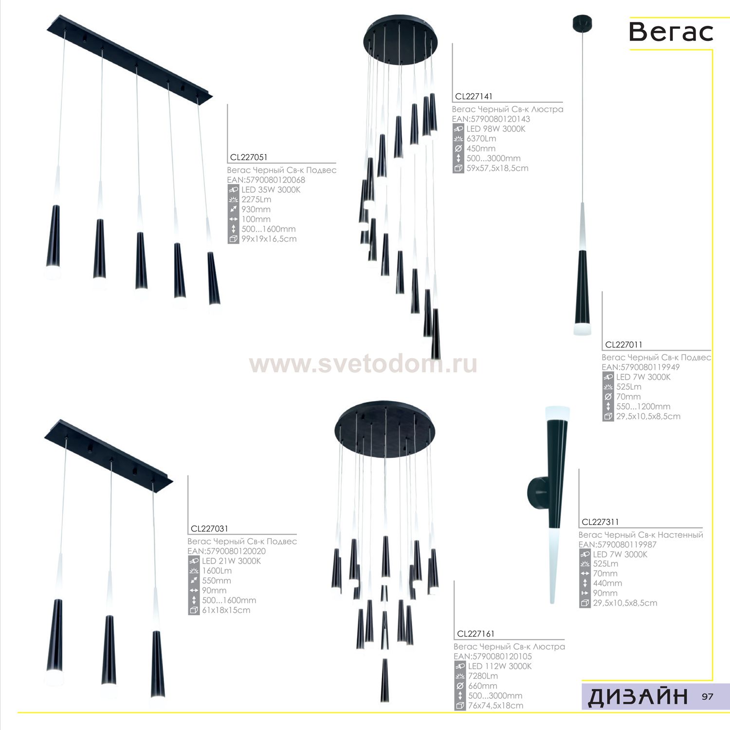 Роскошная подвесная светодиодная слюстра CL227161 с 16-ю конусными плафонами черного цвета из коллекции «Вегас» общей мощностью в 112 Вт. Все подвесы новой коллекции «Вегас» излучают оптимальный для человеческих глаз, мягкий тёплый (3000К) свет, и разр Штрих-код