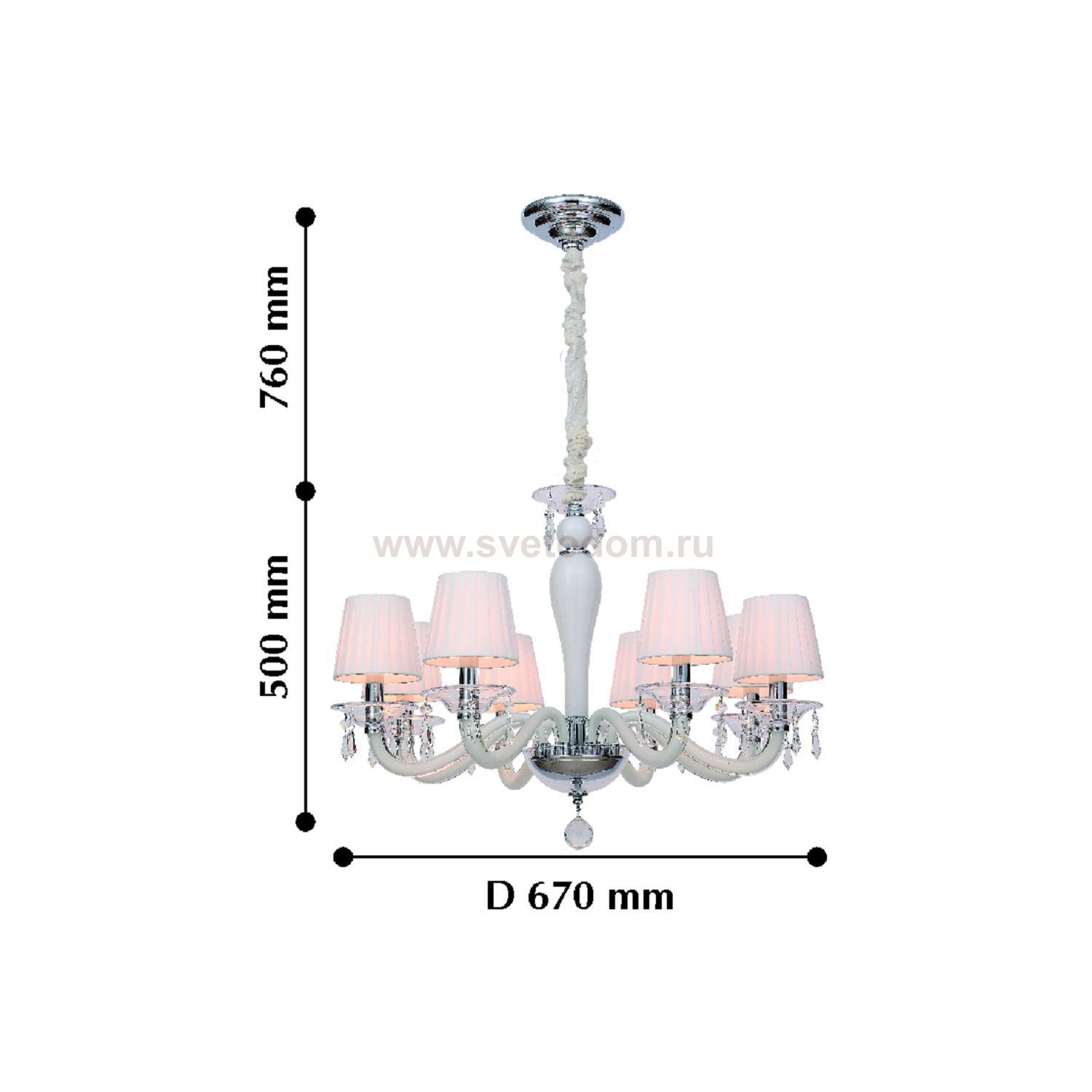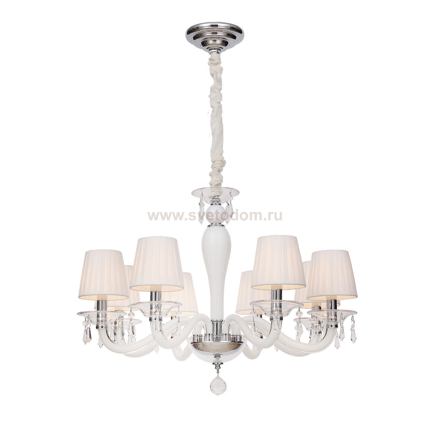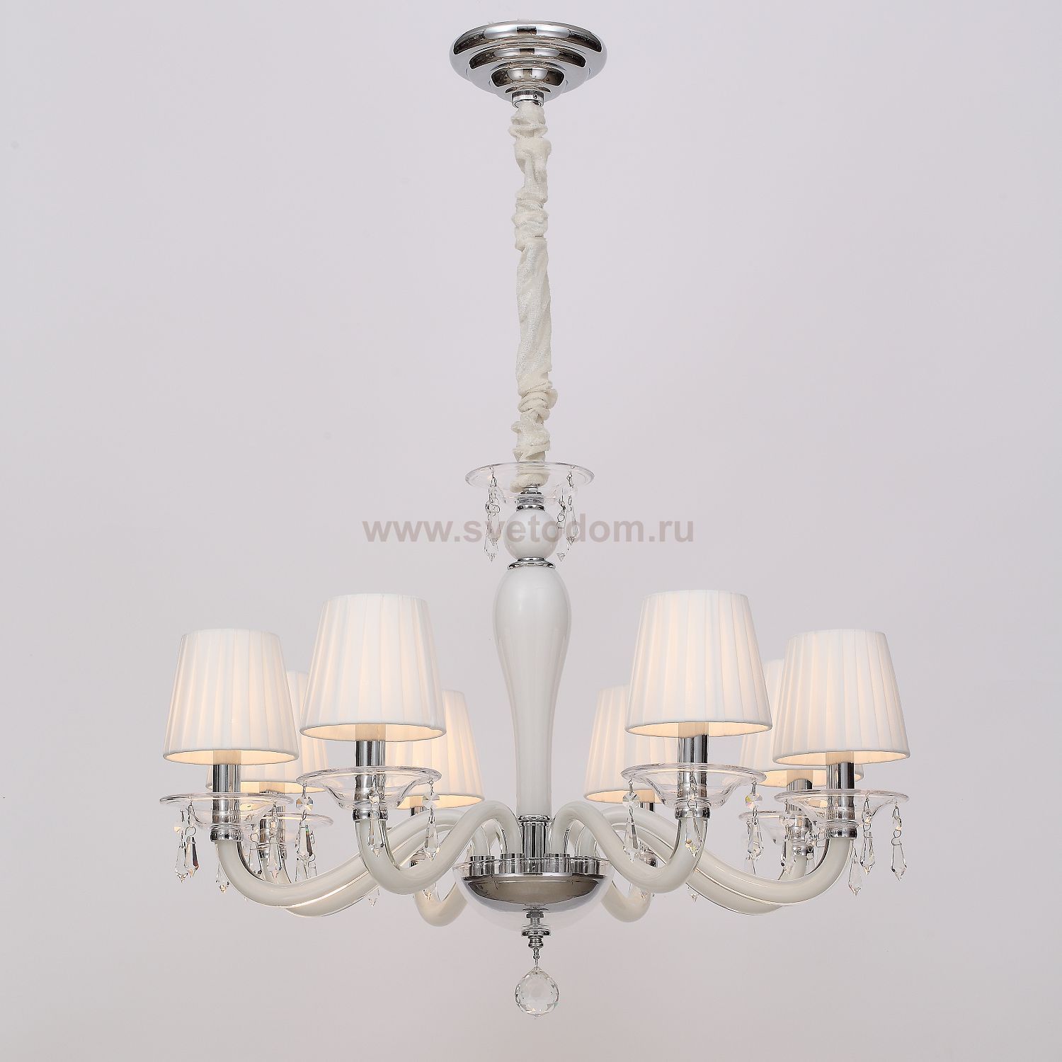 каркас цвета хром, рожки и декоративные элементы из выдувного стекла белого и прозрачного цветов, абажуры из белого хлопка, хрусталь высшего качества Комментарий