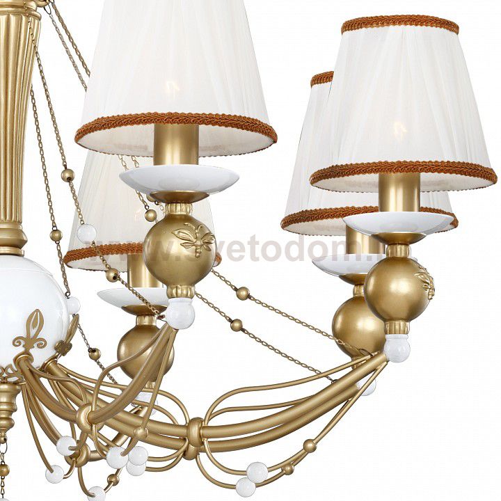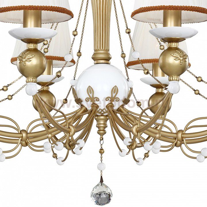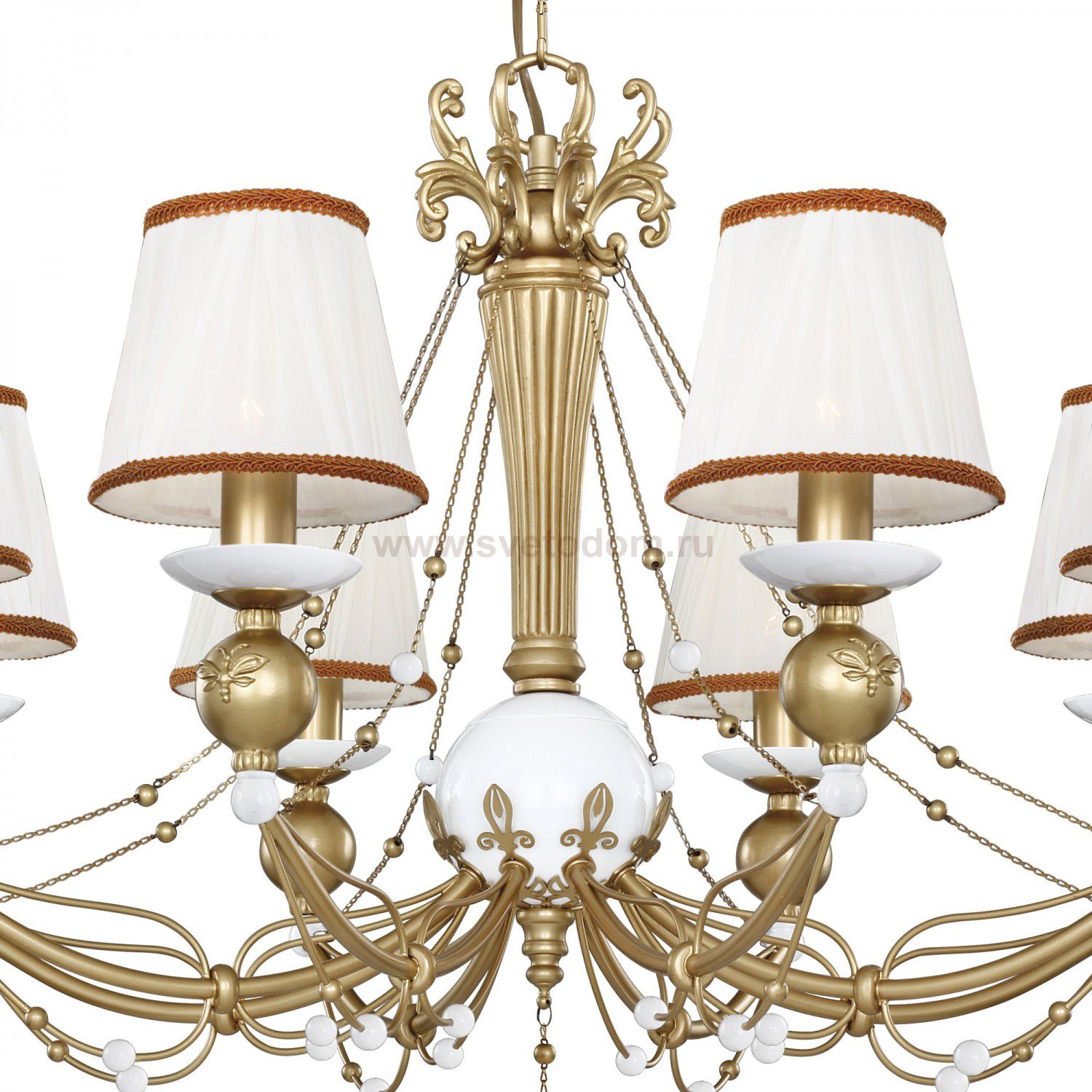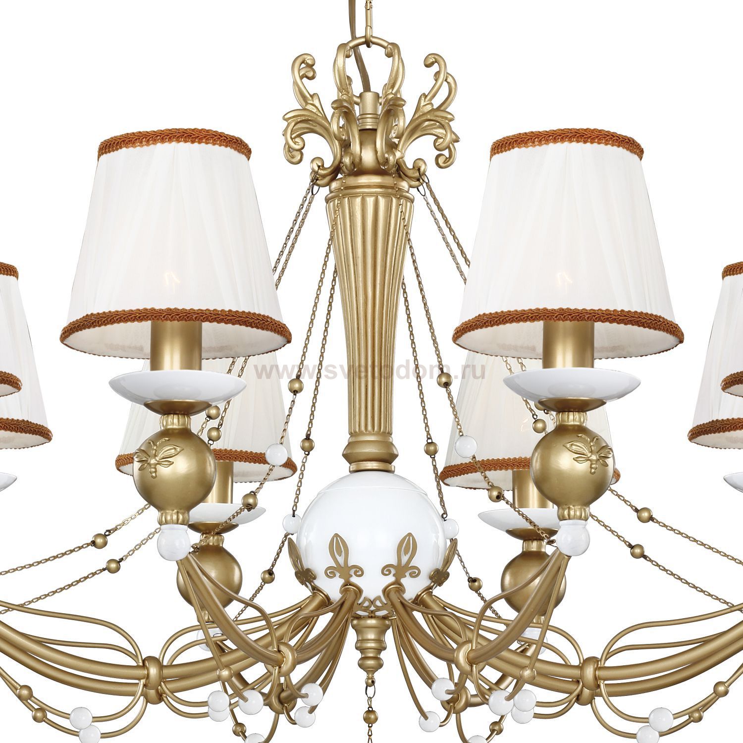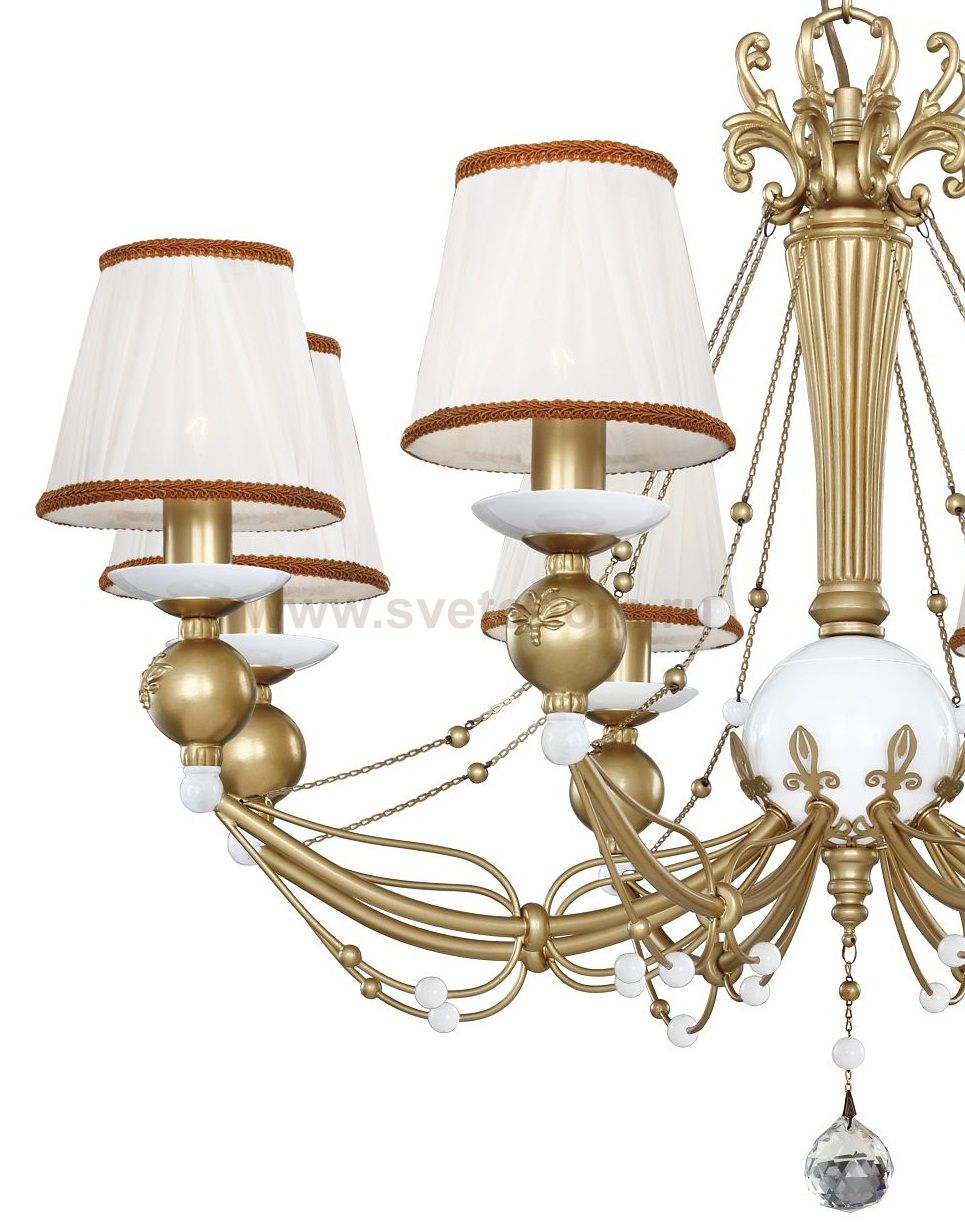 каркас окрашен в золотой цвет с элементами, покрытыми белой эмалью, абажуры из светло-кремовой ткани с коричневой декоративной летной Комментарий
