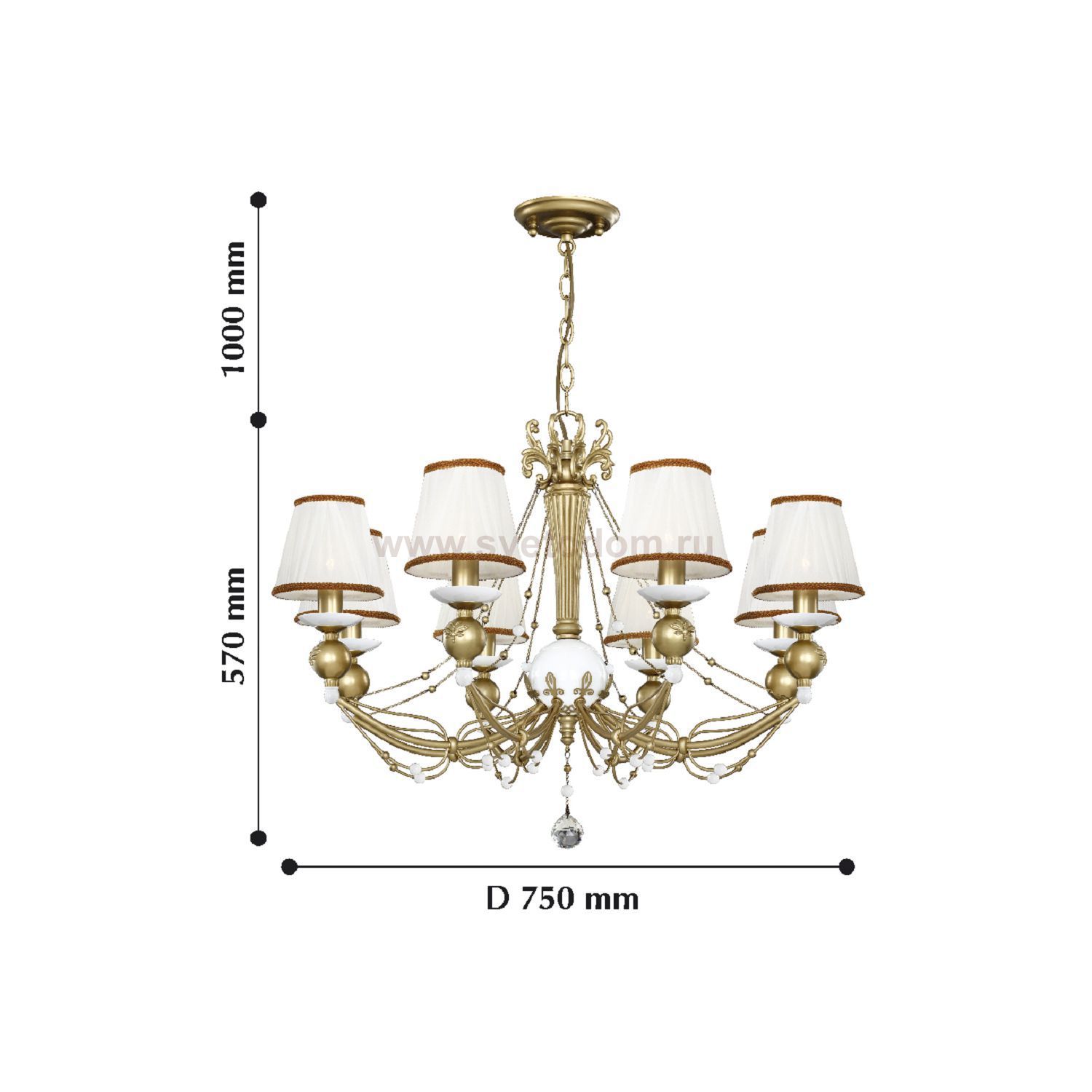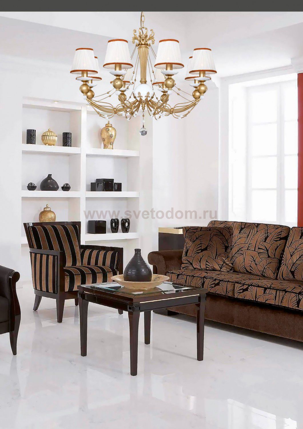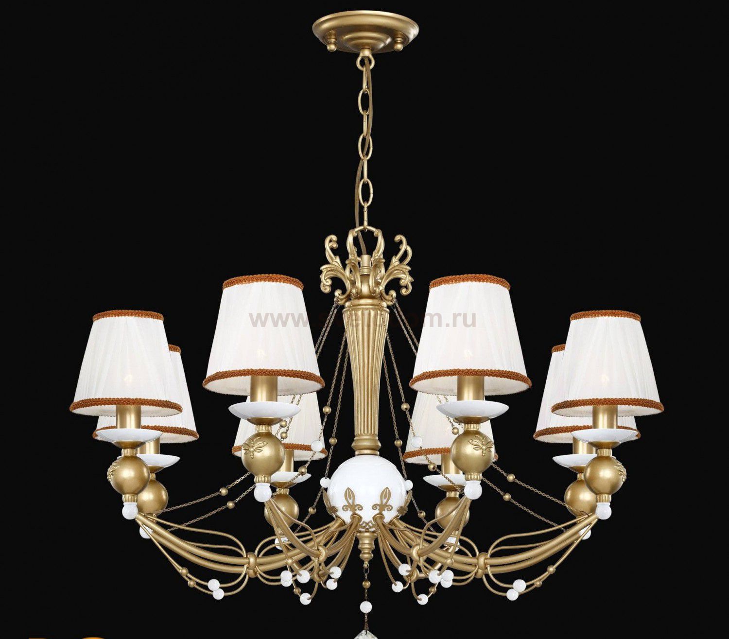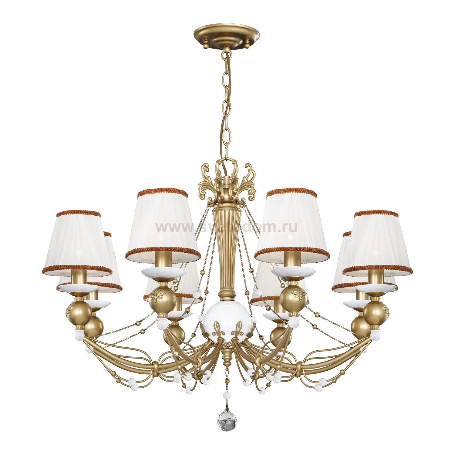 каркас окрашен в золотой цвет с элементами, покрытыми белой эмалью, абажуры из светло-кремовой ткани с коричневой декоративной летной Комментарий