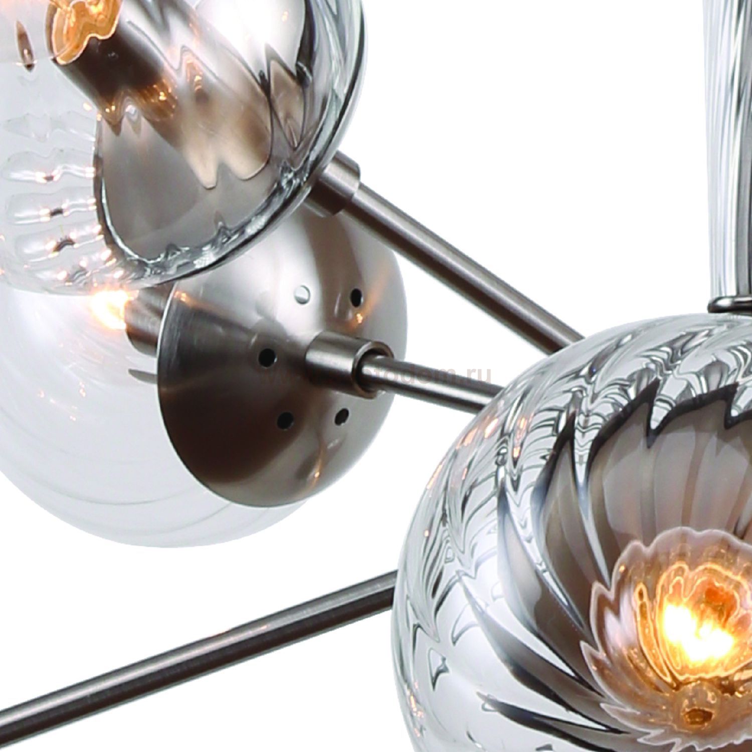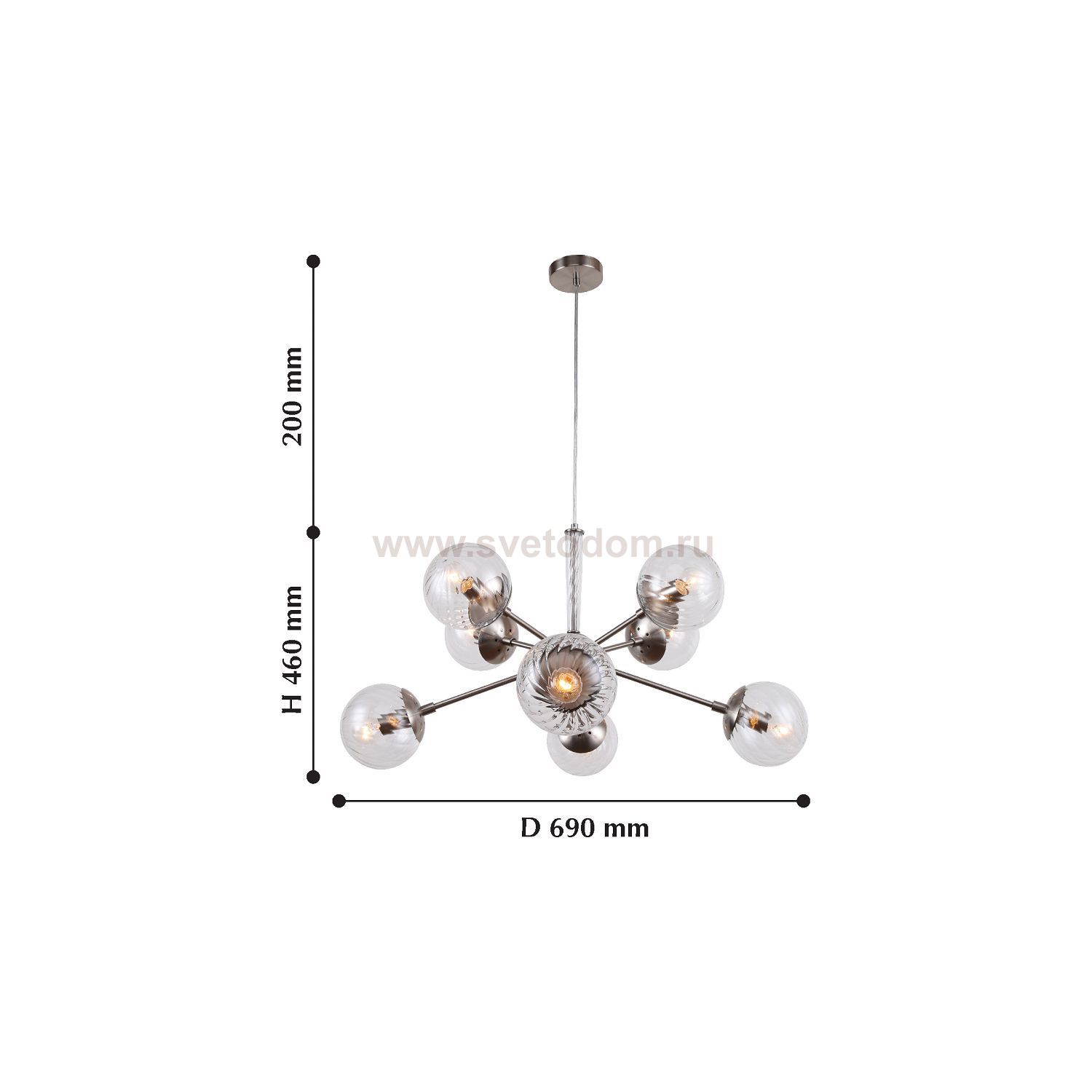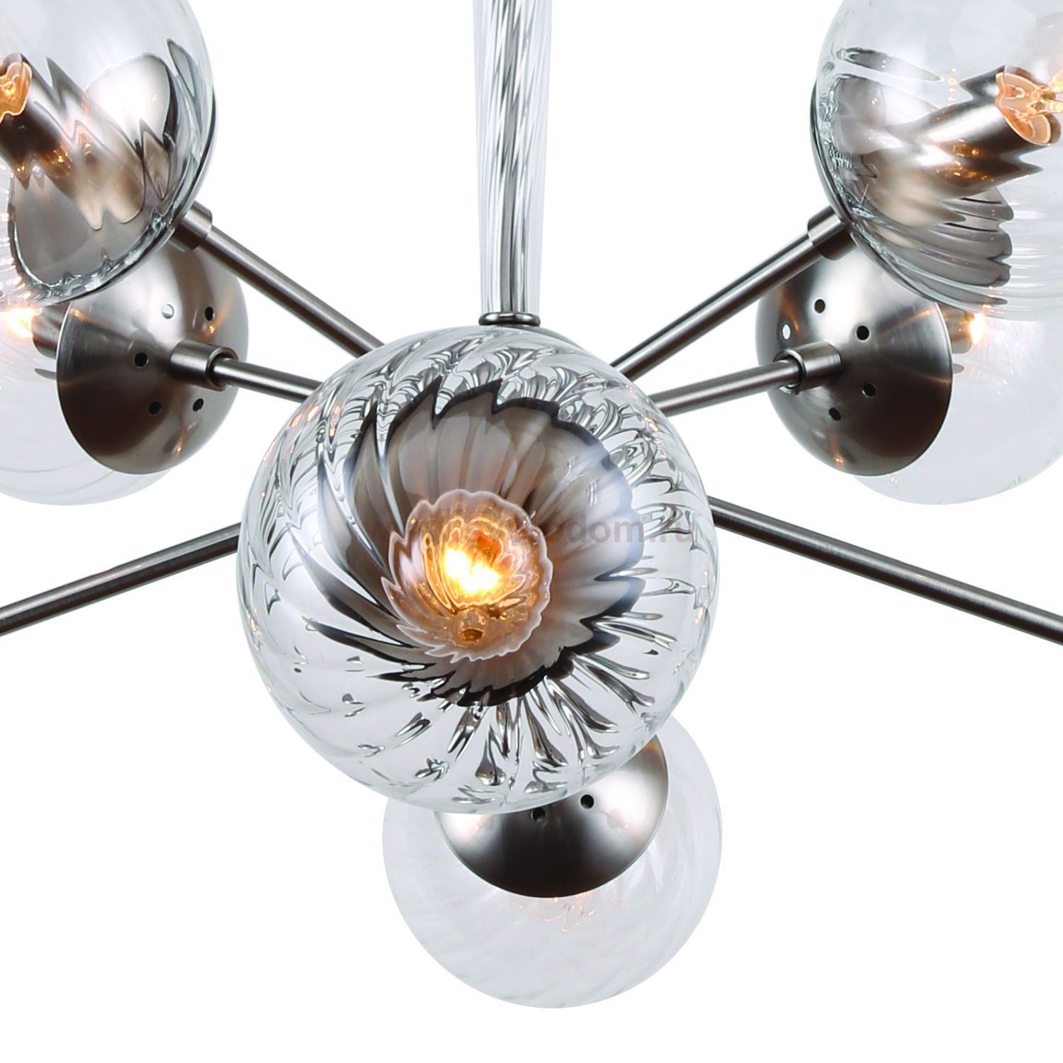 Каркас цвета никель декорирован стеклянным рифленым цилиндром и рожками, напоминающими молекулу благодаря стеклянным шарообразным плафонам. Меняя длину провода люстры можно адаптировать к высоте потолка. Материал плафона