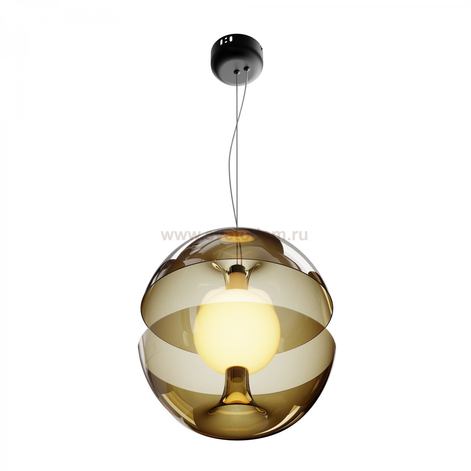 Металлическая арматура в двух оттенках: хром и золото. Плафон из матового стекла. Внешний стеклянный декор в дымчатом и янтарном цвете. Тренд — оптическая иллюзия, эффект парения светового элемента. LED-источник света. Цветовая температура 3000К.