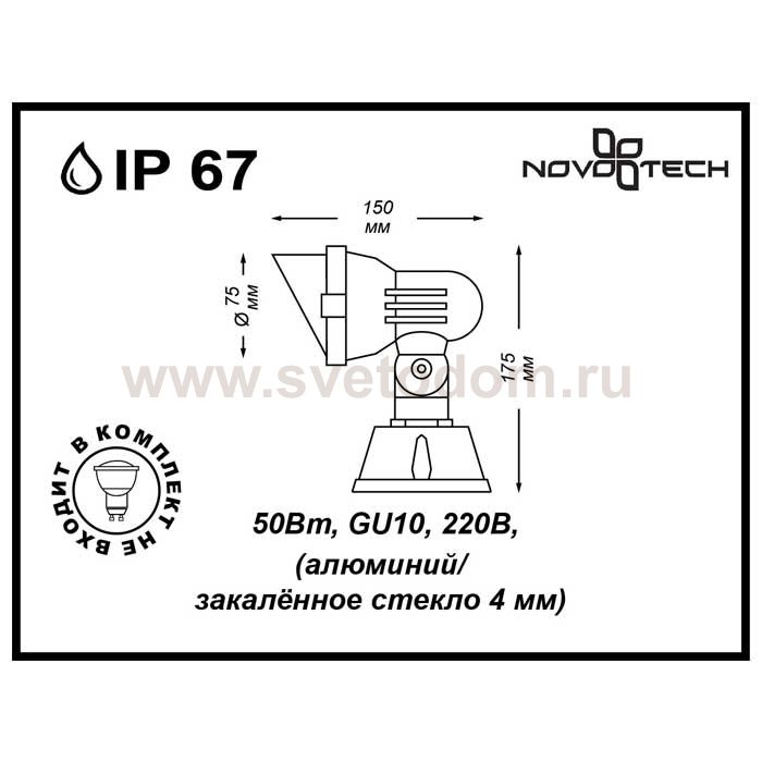 Корпус светильника состоит из алюминия. Это металл, основными достоинствами которого являются — устойчивость к практически всем видам негативного воздействия окружающей среды, коррозии, небольшой вес, по сравнению с другими видами металла и экологическая безопасность материала. Рассеиватель сделан из закаленного стекла. Оно выдерживает температуру от -70 до 250С., а так же в 5-6 раз прочнее обычного. Стакан – пластик. Этот материал имеет высокие эксплуатационные показатели, что объясняется его повышенной стойкостью к механическим повреждениям и защищенностью от факторов внешней среды. Идеально подходит для точного освещения скульптур, растений, деревьев и вывесок или акцентирования архитектурных деталей. Высокая степень защиты. Простота в установке и многократное перемещение (по необходимости).