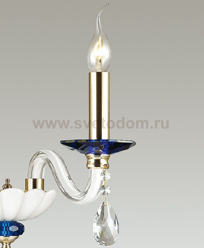 Элегантная линия Elefi выполнена в стиле современной классики. Основные стеклянные элементы выполнены из белого стекла, дополнены синими подставками и украшены прозрачными подвесками из хрусталя. Металлическая арматура окрашена в золотой цвет, который подчеркивает классический стиль люстры и выигрышно контрастирует с бело - синей гаммой. Светильник Elefi прекрасно впишется в классические и современные интерьеры и подчеркнет индивидуальность