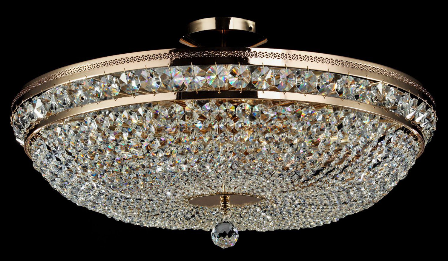 Каждое творение немецкого производителя Maytoni заставляет не просто удивиться, но и поразиться дизайну и низкой стоимости очередной потолочной люстры. Так, хрустальная потолочная люстра Maytoni Diamant Crystal P700-PT60-G состоит из хрустальных подвесок, собранных в полусферу. На фото видно, что расположены они очень близко друг к другу, поэтому свет от 12 ламп будет эффектно преломляться в разные стороны. Золотистая поверхность металлического каркаса очень хорошо отражает свет, исходящий от ламп. Купить такую хрустальную потолочную люстру от Майтони лучше всего в большую гостиную, а дополнить световой рисунок можно аналогичными бра из этой же коллекции. Их вы можете также найти на нашем сайте по ценам, указанным над характеристиками. |