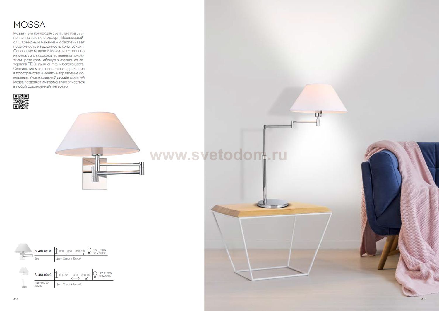 Mossa - эта коллекция светильников , выполненная в стиле модерн. Вращающийся шарнирный механизм обеспечивает подвижность и надежность конструкции. Основание моделей Mossa изготовлено из металла с высококачественным покрытием цвета хром, абажур выполнен из материала ПВХ и льняной ткани белого цвета. Светильник может совершать движения в пространстве и менять направление освещения. Универсальный дизайн моделей Mossa позволяет им гармонично вписаться в любой современный интерьер.