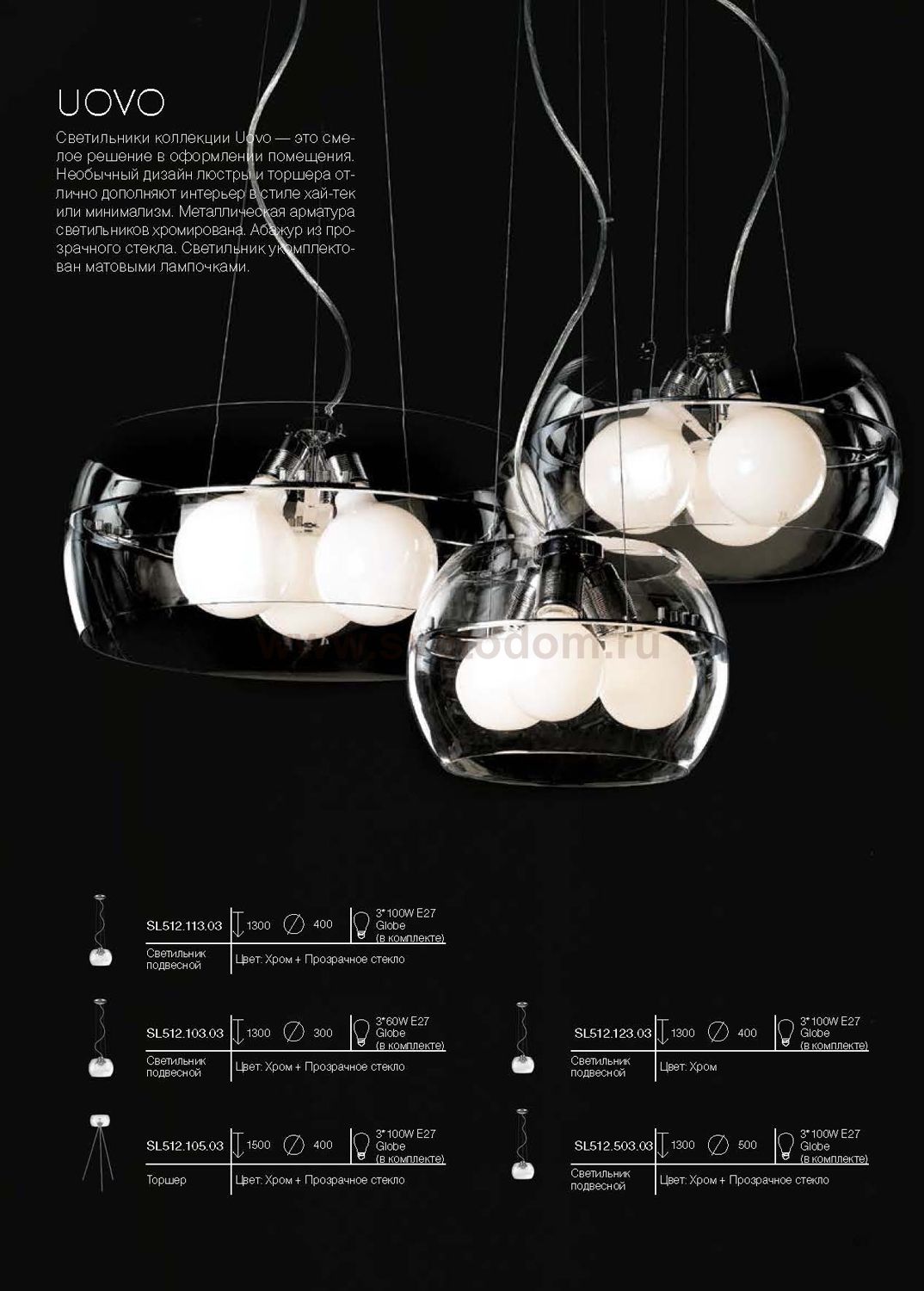 Если Вы настроены купить светильник модели SL51212303, то обратите внимание: Светильники коллекции Uovo - это смелое решение в оформлении помещения. Необычный дизайн люстры и торшера отлично дополняют интерьер в стиле хай-тек или минимализм. Металлическая арматура светильников хромирована. Абажур из прозрачного или дымчатого стекла. Светильник укомплектован матовыми лампочками.
